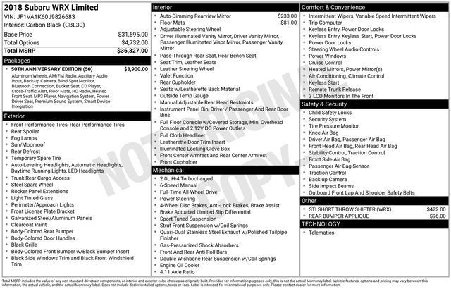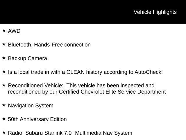 AWD, Bluetooth, Hands-Free connection, Backup Camera, Is a local trade in with a CLEAN history according to AutoCheck!, Reconditioned Vehicle: This vehicle has been inspected and reconditioned by our Certified Chevrolet Elite Service Department, 50th Anniversary Edition, 50th Side Badge, Bumpers: body-color, Carpeted Floor Mats w/50th Logo & Silver Stitching, Jurid Performance Front Brake Pads, Navigation System, Power moonroof, Radio: Subaru Starlink 7.0" Multimedia Nav System, RECARO Performance Design Front Seats, Red Finish Front & Rear Brake Calipers, Smartphone Integration, Sport steering wheel, Velour Chrome Badges, Wheels: 18" High Luster Dark Gray Alloy.21/27 City/Highway MPGTax, title, license and $249.00 document preparation fee are extra. We make every reasonable effort possible to present information and pricing that is true and accurate. Some information provided may come from third party sources. To ensure your complete satisfaction, please verify the accuracy prior to your purchase. It is the responsibility of the consumer to verify the accuracy of information listed.Awards: * ALG Residual Value Awards, Residual Value Awards * 2018 KBB.com Best Resale Value Awards * 2018 KBB.com Brand Image Awards * 2018 KBB.com 10 Most Awarded Brands