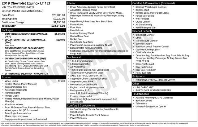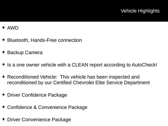 AWD, Bluetooth, Hands-Free connection, Backup Camera, Is a one owner vehicle with a CLEAN report according to AutoCheck!, Reconditioned Vehicle: This vehicle has been inspected and reconditioned by our Certified Chevrolet Elite Service Department, AWD, Confidence & Convenience Package, Driver Confidence Package, Driver Convenience Package, Rear Power Liftgate, Universal Home Remote.Odometer is 27428 miles below market average! 25/30 City/Highway MPG Priced below KBB Fair Purchase Price!Tax, title, license and $249.00 document preparation fee are extra. We make every reasonable effort possible to present information and pricing that is true and accurate. Some information provided may come from third party sources. To ensure your complete satisfaction, please verify the accuracy prior to your purchase. It is the responsibility of the consumer to verify the accuracy of information listed.Awards: * JD Power Initial Quality Study * 2019 KBB.com 10 Best SUVs Under $30,000