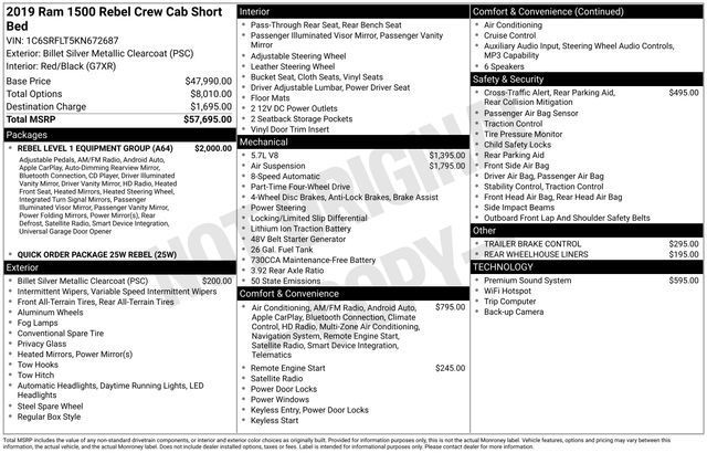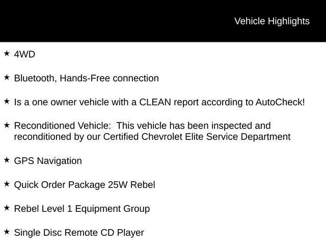 4WD, Bluetooth, Hands-Free connection, Is a one owner vehicle with a CLEAN report according to AutoCheck!, Reconditioned Vehicle: This vehicle has been inspected and reconditioned by our Certified Chevrolet Elite Service Department, 8.4" Touchscreen Display, Apple CarPlay, Auto-Dimming Exterior Driver Mirror, Auto-Dimming Rear-View Mirror, Body Color Door Handles, Exterior Mirrors Courtesy Lamps, Exterior Mirrors w/Supplemental Signals, Foam Bottle Insert (Door Trim Panel), Google Android Auto, GPS Navigation, Heated Front Seats, Heated Steering Wheel, Integrated Center Stack Radio, Power Adjustable Pedals, Power Heated Fold Away Mirrors, Power-Folding Mirrors, Quick Order Package 25W Rebel, Radio: Uconnect 4 w/8.4" Display, Rear Dome w/On/Off Switch Lamp, Rear Window Defroster, Rebel Level 1 Equipment Group, Single Disc Remote CD Player, Sun Visors w/Illuminated Vanity Mirrors, Universal Garage Door Opener.Odometer is 5532 miles below market average! Priced below KBB Fair Purchase Price!Tax, title, license and $249.00 document preparation fee are extra. We make every reasonable effort possible to present information and pricing that is true and accurate. Some information provided may come from third party sources. To ensure your complete satisfaction, please verify the accuracy prior to your purchase. It is the responsibility of the consumer to verify the accuracy of information listed.Awards: * Motor Trend Automobiles of the year * 2019 KBB.com 10 Favorite New-for-2019 Cars * 2019 KBB.com Best Auto Tech Awards * NACTOY 2019 North American Truck of the Year * 2019 KBB.com 10 Best Road Trip Cars