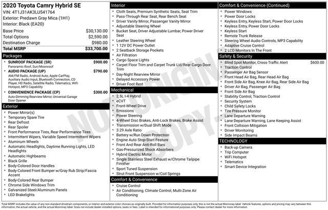 Discover the exceptional 2020 Toyota Camry Hybrid SE, a remarkable blend of efficiency, technology, and style. This meticulously reconditioned vehicle is a standout choice, offering an exceptional ownership experience.- Backup Camera- Bluetooth, Hands-Free connection- Keyless Entry- Blind Spot Monitor with Rear Cross Traffic Alert- Lane Change Assist- Convenience Package with Auto-Dimming Rearview Mirror and HomeLink- Sunroof Package with Power Tilt/Sliding Sunroof and Moonroof- Audio Package with 8-inch Touchscreen, Android Auto, Apple CarPlay, and moreWith an EPA-estimated 44 city/47 highway MPG, this Camry Hybrid SE delivers exceptional fuel efficiency without compromising performance. The 2.5L I4 DOHC 16V engine and eCVT transmission provide a smooth, responsive driving experience, while the front-wheel-drive layout ensures confident handling.Beyond its impressive powertrain, the Camry Hybrid SE boasts a wealth of advanced safety features, including Automatic High-Beam Headlights, Brake Assist, Electronic Stability Control, and a suite of airbags for your protection. The sleek exterior design is complemented by 18-inch Black Machined-Finish Alloy wheels, creating a bold, sporty presence.Inside, the Camry Hybrid SE pampers you with thoughtful amenities. Enjoy the comfort of Fabric Seat Trim with SofTex, the convenience of Steering Wheel-Mounted Audio Controls, and the connectivity of Apple CarPlay and Android Auto integration. The Rear-View Camera and Rear Cross-Traffic Alert provide added peace of mind when maneuvering in tight spaces.This 2020 Toyota Camry Hybrid SE is a local trade-in with a clean AutoCheck history, ensuring you can purchase with confidence. Our Certified Chevrolet Elite Service Department has thoroughly inspected and reconditioned this vehicle to meet our high standards.Experience the perfect balance of efficiency, technology, and style with the 2020 Toyota Camry Hybrid SE. Schedule a test drive today and discover why this exceptional vehicle should be your next automotive partner.Tax, title, license and $249.00 document preparation fee are extra. We make every reasonable effort possible to present information and pricing that is true and accurate. Some information provided may come from third party sources. To ensure your complete satisfaction, please verify the accuracy prior to your purchase. It is the responsibility of the consumer to verify the accuracy of information listed.