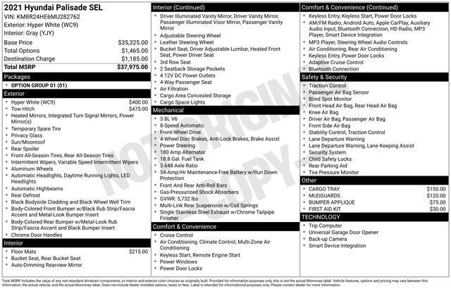 The 2021 Hyundai Palisade SEL is a sophisticated and capable SUV that's ready to elevate your driving experience. With its sleek exterior, spacious interior, and impressive performance, this Palisade is the perfect blend of style and substance.- Bluetooth, Hands-Free connection- Backup Camera- Reconditioned Vehicle: This vehicle has been inspected and reconditioned by our Certified Chevrolet Elite Service Department- TOW HITCH- Hyper White- CARGO TRAY- MUDGUARDS- BUMPER APPLIQUE- FIRST AID KIT- Steering wheel mounted audio controls- Power moonroof- Apple CarPlay & Android Auto- Reclining 3rd row seatBeneath the sleek exterior, the Palisade's powerful V6 engine and 8-speed automatic transmission deliver a smooth and responsive driving experience, while the front-wheel-drive configuration ensures confident handling on the road. With an impressive EPA-estimated 19 MPG in the city and 26 MPG on the highway, this SUV offers the perfect balance of power and efficiency.Inside, the Palisade's spacious and well-appointed cabin provides ample room for up to eight passengers, with reclining third-row seats and a host of advanced technology features, including a backup camera and Bluetooth connectivity. The Palisade's premium cloth upholstery and available power driver's seat ensure a comfortable and customizable driving experience.Whether you're hauling the family, tackling weekend adventures, or simply enjoying the daily commute, the 2021 Hyundai Palisade SEL is a versatile and capable SUV that's sure to exceed your expectations. With its exceptional value, impressive features, and uncompromising quality, this Palisade is a must-see for any discerning buyer.Schedule a test drive today and experience the difference for yourself. We're confident you'll be impressed by the Palisade's exceptional performance, premium amenities, and exceptional value.Tax, title, license and $249.00 document preparation fee are extra. We make every reasonable effort possible to present information and pricing that is true and accurate. Some information provided may come from third party sources. To ensure your complete satisfaction, please verify the accuracy prior to your purchase. It is the responsibility of the consumer to verify the accuracy of information listed.