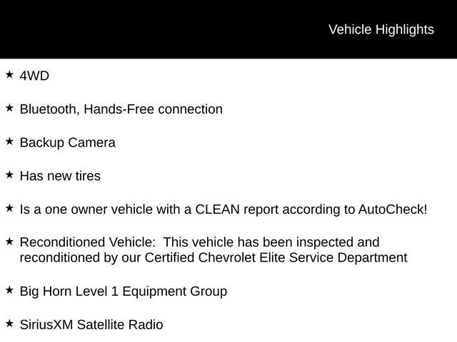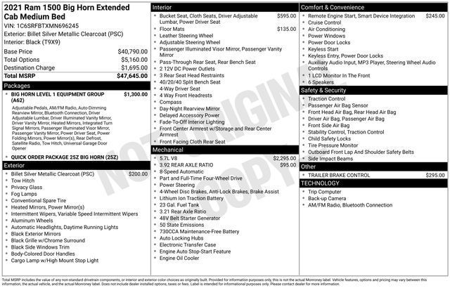 Discover the perfect blend of power, capability, and convenience with this exceptional 2021 Ram 1500 Big Horn/Lone Star. Boasting a robust HEMI 5.7L V8 engine, 4-wheel drive, and a host of premium features, this truck is ready to take on any challenge with confidence.- Bluetooth, Hands-Free connection- Backup Camera- New tires- One-owner vehicle with a clean AutoCheck report- Reconditioned by our Certified Chevrolet Elite Service DepartmentThis Big Horn/Lone Star model comes equipped with a wealth of desirable features, including the Uconnect 4 infotainment system with an 8.4-inch display, SiriusXM satellite radio, a power-sliding rear window, power-folding mirrors, and a universal garage door opener. The 3.5-inch TFT color display in the instrument cluster provides vital information at a glance, while the power-adjustable pedals and 8-way power driver's seat with 4-way lumbar support ensure a comfortable driving experience.Exterior highlights include the bold Big Horn badge, black premium power mirrors, and the Billet Silver Metallic Clearcoat paint that gives this Ram a sleek, modern appearance. The included Class IV receiver hitch makes it easy to tow your favorite toys or equipment, while the Trailer Brake Control feature provides added peace of mind.Step inside the spacious cabin and you'll be greeted by the Black Deluxe Cloth bucket seats, which offer ample support and comfort. The full-length floor console provides convenient storage and organization, while the rear 60/40 split-folding bench seat allows you to easily accommodate passengers and cargo.With its impressive 4-wheel drive capabilities, powerful HEMI V8 engine, and a host of premium features, this 2021 Ram 1500 Big Horn/Lone Star is the perfect choice for those who demand more from their truck. Experience the difference for yourself by scheduling a test drive today.Tax, title, license and $249.00 document preparation fee are extra. We make every reasonable effort possible to present information and pricing that is true and accurate. Some information provided may come from third party sources. To ensure your complete satisfaction, please verify the accuracy prior to your purchase. It is the responsibility of the consumer to verify the accuracy of information listed.