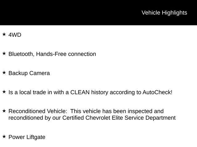 4WD, Bluetooth, Hands-Free connection, Backup Camera, Is a local trade in with a CLEAN history according to AutoCheck!, Reconditioned Vehicle: This vehicle has been inspected and reconditioned by our Certified Chevrolet Elite Service Department, 4WD, Power Liftgate.20/27 City/Highway MPGTax, title, license and $249.00 document preparation fee are extra. We make every reasonable effort possible to present information and pricing that is true and accurate. Some information provided may come from third party sources. To ensure your complete satisfaction, please verify the accuracy prior to your purchase. It is the responsibility of the consumer to verify the accuracy of information listed.