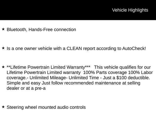 Bluetooth, Hands-Free connection, Is a one owner vehicle with a CLEAN report according to AutoCheck!, **Lifetime Powertrain Limited Warranty*** This vehicle qualifies for our Lifetime Powertrain Limited warranty 100% Parts coverage 100% Labor coverage.- Unlimited Mileage- Unlimited Time - Just a $100 deductible. Simple and easy Just follow recommended maintenance at selling dealer or at a pre-a, Steering wheel mounted audio controls.26/31 City/Highway MPG Priced below KBB Fair Purchase Price!Tax, title, license and $249.00 document preparation fee are extra. We make every reasonable effort possible to present information and pricing that is true and accurate. Some information provided may come from third party sources. To ensure your complete satisfaction, please verify the accuracy prior to your purchase. It is the responsibility of the consumer to verify the accuracy of information listed.
