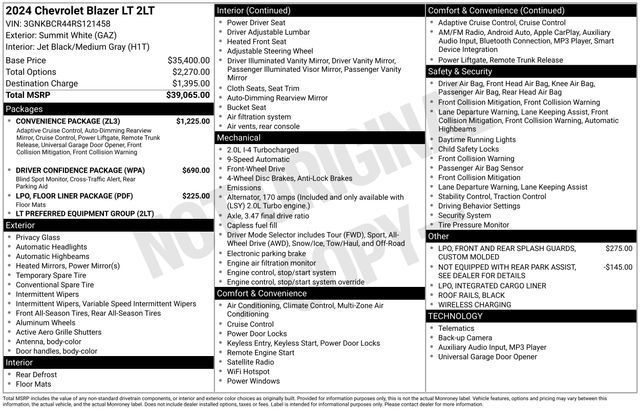Discover the 2024 Chevrolet Blazer LT, a versatile and well-equipped SUV that's ready to elevate your driving experience. With its sleek white exterior, turbocharged engine, and impressive fuel efficiency, this Blazer LT is the perfect blend of style and performance.• Bluetooth and Hands-Free Connection• Keyless Entry• Backup Camera• Lifetime Powertrain Limited WarrantyThe 2024 Blazer LT also comes equipped with a Convenience Package and Driver Confidence Package, offering a wealth of advanced features:• Adaptive Cruise Control• Wireless Charging• Enhanced Automatic Emergency Braking• Lane Change Alert with Side Blind Zone Alert• Rear Cross Traffic Alert• Rear Park AssistStep inside and you'll be greeted by a premium audio system, dual-zone automatic climate control, and power-adjustable driver's seat. The split-folding rear seat provides ample cargo space, making this Blazer LT the perfect companion for your adventures.Boasting an impressive 22 city and 29 highway MPG, this Blazer LT delivers exceptional efficiency without compromising power. The 2.0L turbocharged engine and 9-speed automatic transmission provide a smooth and responsive driving experience, ensuring you'll enjoy every mile behind the wheel.As a one-owner vehicle with a clean AutoCheck report, this Blazer LT is a true gem. And with our Lifetime Powertrain Limited Warranty, you can drive with confidence, knowing your investment is protected.Don't miss your chance to experience the 2024 Chevrolet Blazer LT. Schedule a test drive today and discover the perfect balance of style, technology, and performance that this SUV has to offer.Tax, title, license and $249.00 document preparation fee are extra. We make every reasonable effort possible to present information and pricing that is true and accurate. Some information provided may come from third party sources. To ensure your complete satisfaction, please verify the accuracy prior to your purchase. It is the responsibility of the consumer to verify the accuracy of information listed.