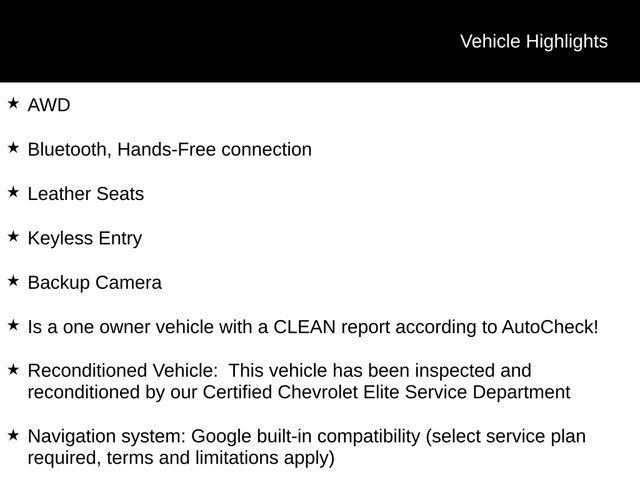 Experience the future of driving with the 2025 Chevrolet Equinox EV RS. This all-electric SUV combines cutting-edge technology, exceptional performance, and uncompromising style to deliver an unparalleled driving experience.Packed with an impressive array of features, the Equinox EV RS stands out from the crowd. Key highlights include:- AWD- Bluetooth, Hands-Free connection- Leather Seats- Keyless Entry- Backup Camera- One-owner vehicle with a CLEAN AutoCheck report- Reconditioned by our Certified Chevrolet Elite Service DepartmentThe Equinox EV RS also boasts a comprehensive Convenience Package II, which includes:- Driver memory presets- Front passenger 6-way power seat adjuster- Front passenger 2-way power lumbar seat adjuster- Dual-zone automatic climate control- Heated wiper park- Rear camera mirror washer- Rear camera mirror- Heated rear outboard passenger cushion- Ventilated driver and front passenger seats- 21-inch tires- LED headlamps and tail lamps- Head-up display- Universal home remoteElevate your driving experience with the Equinox EV RS's impressive list of starred features:- Google built-in navigation compatibility- Dual Motor All-Wheel Drive (AWD)- Dual-Zone Automatic Climate Control- Driver Memory- Front Passenger 6-Way Power Seat Adjuster- Head-Up Display- Universal Home Remote- Power Liftgate- LED Headlamps- Front Electric AWD- Rear Camera Mirror Washer- Uplevel Neutral Density LED Tail Lamps- Rear Camera Mirror- 2-Way Front Passenger Power Lumbar- Heated Rear Outboard Passenger Cushion- Ventilated Driver and Front Passenger Seats- Heated Wiper ParkDiscover the perfect balance of style, technology, and performance with the 2025 Chevrolet Equinox EV RS. Experience the future of driving today by scheduling a test drive at our showroom.Tax, title, license and $249.00 document preparation fee are extra. We make every reasonable effort possible to present information and pricing that is true and accurate. Some information provided may come from third party sources. To ensure your complete satisfaction, please verify the accuracy prior to your purchase. It is the responsibility of the consumer to verify the accuracy of information listed.