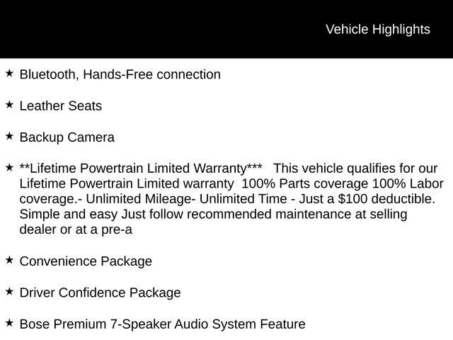 Bluetooth, Hands-Free connection, Leather Seats, Backup Camera, **Lifetime Powertrain Limited Warranty*** This vehicle qualifies for our Lifetime Powertrain Limited warranty 100% Parts coverage 100% Labor coverage.- Unlimited Mileage- Unlimited Time - Just a $100 deductible. Simple and easy Just follow recommended maintenance at selling dealer or at a pre-a, 120-Volt Power Outlet, Adaptive Cruise Control, Bose Premium 7-Speaker Audio System Feature, Cabin Humidity Sensor, Convenience Package, Driver Confidence Package, Hands Free Power Programmable Liftgate, Inside Rear-View Auto-Dimming Mirror, Rear Cross Traffic Alert, Rear Park Assist, Single-Zone Automatic Climate Control, Wireless Charging.Tax, title, license and $249.00 document preparation fee are extra. Pricing will not include additional installed accessories. Not available with special finance or lease offers. We make every reasonable effort possible to present information and pricing that is true and accurate. Some information provided may come from third party sources. To ensure your complete satisfaction, please verify the accuracy prior to your purchase. It is the responsibility of the consumer to verify the accuracy of information listed.29/33 City/Highway MPG