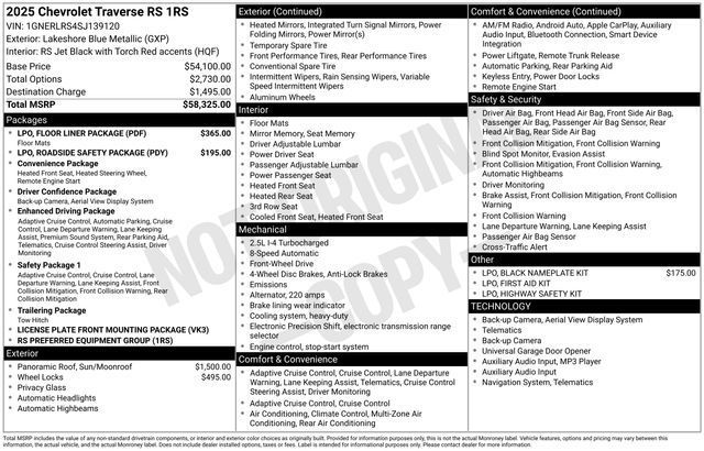 Discover the ultimate family adventure with the 2025 Chevrolet Traverse RS. This versatile and stylish SUV is poised to elevate your driving experience, offering a perfect blend of power, technology, and refined luxury.- Bluetooth, Hands-Free connection- Leather Seats- Keyless Entry- Backup Camera- Lifetime Powertrain Limited WarrantyIndulge in the unparalleled convenience of the Traverse RS, featuring a SUNROOF, POWER, DUAL GLASS, PANORAMIC, SLIDING, WITH POWER SUNSHADE, as well as the added protection of the BLACK LUG NUT AND WHEEL LOCK KIT and the comprehensive FLOOR LINER PACKAGE. Stay safe and prepared with the ROADSIDE SAFETY PACKAGE, complete with a First-Aid Kit and Highway Safety Kit.Elevate your driving experience with the Traverse RS's advanced technologies, including a state-of-the-art NAVIGATION SYSTEM, POWER DUAL GLASS PANORAMIC SLIDING SUNROOF, and POWER LIFTGATE. Surround yourself with the exceptional sound quality of the BOSE PREMIUM 12-SPEAKER AUDIO SYSTEM and enjoy the seamless connectivity of APPLE CARPLAY/ANDROID AUTO.Comfort and style are the hallmarks of the Traverse RS, with features like HEATED FRONT SEATS, VENTILATED FRONT SEATS, and HEATED REAR SEATS. The PERFORATED LEATHER-APPOINTED SEAT TRIM and SPORT STEERING WHEEL add a touch of refinement to your daily drives.Safety is paramount in the Traverse RS, with advanced features like CHILD-SEAT-SENSING AIRBAG, ELECTRONIC STABILITY CONTROL, and REAR PARKING CAMERA ensuring your peace of mind on the road.Experience the ultimate in versatility and capability with the 2025 Chevrolet Traverse RS. Discover the perfect blend of power, technology, and luxury that will elevate your driving experience. Visit our showroom today and let us demonstrate how this exceptional SUV can transform your daily commute and family adventures.Tax, title, license and $249.00 document preparation fee are extra. We make every reasonable effort possible to present information and pricing that is true and accurate. Some information provided may come from third party sources. To ensure your complete satisfaction, please verify the accuracy prior to your purchase. It is the responsibility of the consumer to verify the accuracy of information listed.