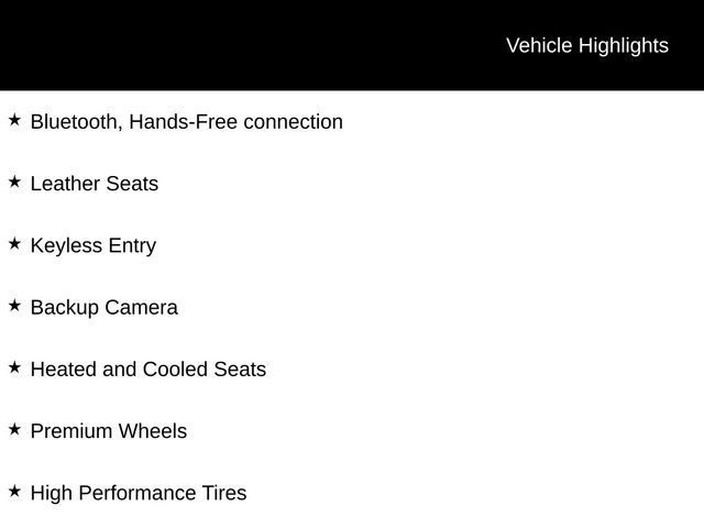 Bluetooth, Hands-Free connection, Leather Seats, Keyless Entry, Backup Camera, Heated and Cooled Seats, Premium Wheels, High Performance Tires.Tax, title, license and $249.00 document preparation fee are extra. Pricing will not include additional installed accessories. Not available with special finance or lease offers. We make every reasonable effort possible to present information and pricing that is true and accurate. Some information provided may come from third party sources. To ensure your complete satisfaction, please verify the accuracy prior to your purchase. It is the responsibility of the consumer to verify the accuracy of information listed.