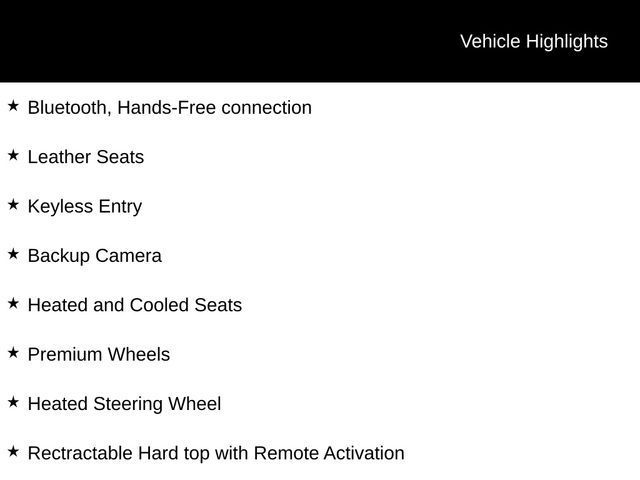 Bluetooth, Hands-Free connection, Leather Seats, Keyless Entry, Backup Camera, Heated and Cooled Seats, Premium Wheels, Heated Steering Wheel, Rectractable Hard top with Remote Activation.Tax, title, license and $249.00 document preparation fee are extra. Pricing will not include additional installed accessories. Not available with special finance or lease offers. We make every reasonable effort possible to present information and pricing that is true and accurate. Some information provided may come from third party sources. To ensure your complete satisfaction, please verify the accuracy prior to your purchase. It is the responsibility of the consumer to verify the accuracy of information listed.