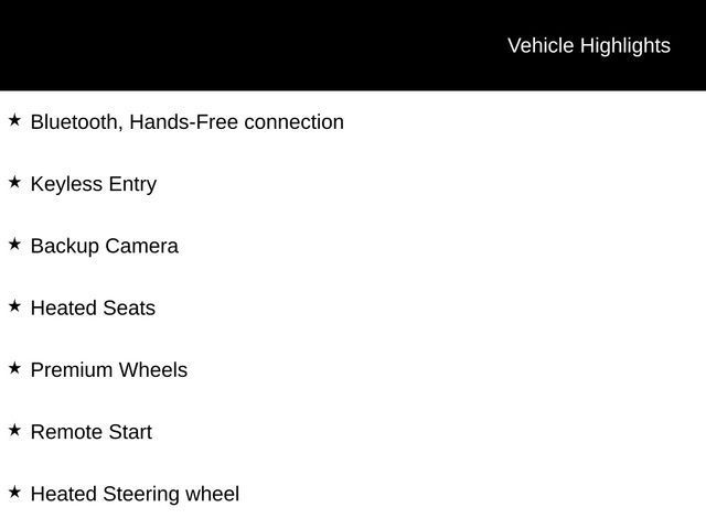 Bluetooth, Hands-Free connection, Keyless Entry, Backup Camera, Heated Seats, Premium Wheels, Remote Start, Heated Steering wheel.Tax, title, license and $249.00 document preparation fee are extra. Pricing will not include additional installed accessories. Not available with special finance or lease offers. We make every reasonable effort possible to present information and pricing that is true and accurate. Some information provided may come from third party sources. To ensure your complete satisfaction, please verify the accuracy prior to your purchase. It is the responsibility of the consumer to verify the accuracy of information listed.20/26 City/Highway MPG