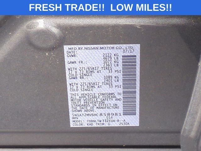 Discover the perfect balance of style, technology, and capability in this 2017 Nissan Rogue SV. This versatile crossover SUV offers a compelling blend of features and performance that make it an exceptional value in the pre-owned market.- CARFAX Certified- Extended Service Contract Available- Recent Local Trade- All Books and KeysThe Rogue SV comes equipped with a suite of premium upgrades, including the SV Premium Package and Sun & Sound Touring Package. Enjoy the convenience of a Motion Activated Liftgate, the visibility of an Around View Monitor, and the connectivity of NissanConnect with Navigation. The Bose audio system and panoramic moonroof further enhance your driving experience.Safety is paramount, and this Rogue SV delivers with advanced features like Blind Spot Warning, Brake Assist, and Electronic Stability Control. The all-wheel-drive system provides confident handling in a variety of weather conditions, while the 2.5L 4-cylinder engine delivers an exceptional 32 MPG on the highway.The interior of this Rogue SV is equally impressive, with heated leather-wrapped steering wheel, heated front seats, and a spacious, versatile cabin. The 60/40 split-folding rear seats allow you to easily accommodate passengers and cargo, making this an ideal choice for families or those with active lifestyles.Backed by Nissan's reputation for reliability and quality, this 2017 Rogue SV represents an exceptional opportunity to own a feature-rich, well-equipped crossover at an exceptional value. We invite you to schedule a test drive and experience the difference for yourself. Our knowledgeable team is here to answer any questions you may have and help you find the perfect vehicle to meet your needs.