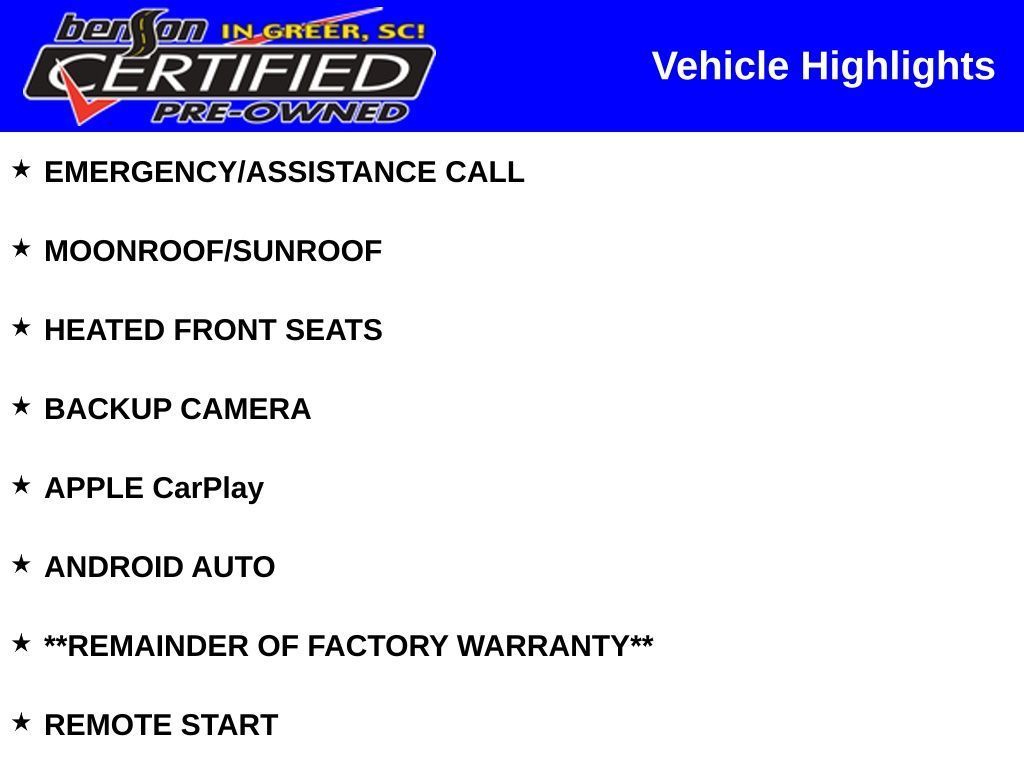 PRICED BELOW J.D.POWER RETAIL PRICE OF $47,000. EMERGENCY/ASSISTANCE CALL, MOONROOF/SUNROOF, HEATED FRONT SEATS, BACKUP CAMERA, APPLE CarPlay, ANDROID AUTO, **REMAINDER OF FACTORY WARRANTY**, REMOTE START.Recent Arrival! Odometer is 1086 miles below market average!All prices exclude sales tax, tag, title and registration. Final prices may be subject to credit approval. Additionally, we do not and cannot guarantee that every vehicle sold will be recall-free. Visit safercar.gov to determine whether an individual vehicle is subject to an open recall. All discounted new vehicle prices include any available incentives in lieu of factory APR specials. We make every effort to ensure accurate and reliable information, but are not responsible for website errors. Mention this advertisement to your salesperson and sales management to receive the advertised price. Advertised prices are subject to $239 millennium package if already applied to advertised vehicle.