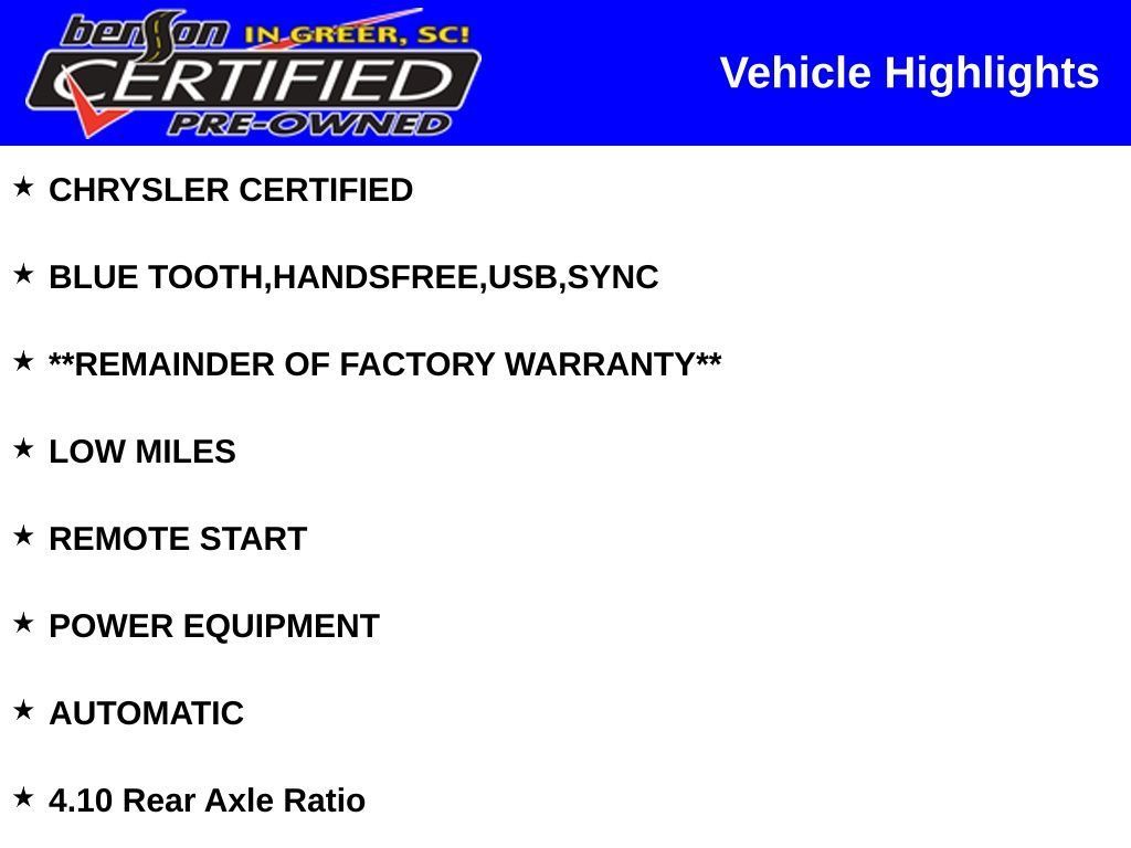 PRICED BELOW J.D.POWER RETAIL PRICE OF $46,100. BLIND SPOT AND CROSS PATH DETECTION, EMERGENCY/ASSISTANCE CALL, LEATHER INTERIOR, NAVIGATION, HEATED FRONT SEATS, BACKUP CAMERA, APPLE CarPlay, ANDROID AUTO, CHRYSLER CERTIFIED, BLUE TOOTH,HANDSFREE,USB,SYNC, **REMAINDER OF FACTORY WARRANTY**, LOW MILES, REMOTE START, POWER EQUIPMENT, AUTOMATIC, 4.10 Rear Axle Ratio. Certified.Recent Arrival! Odometer is 17476 miles below market average!FCA US LLC Certified Pre-Owned Details: * Transferable Warranty * Vehicle History * Powertrain Limited Warranty: 84 Month/100,000 Mile (whichever comes first) from original in-service date * 125 Point Inspection * Warranty Deductible: $100 * Vehicles Up to 75,000 Miles and/or 5 Model Years. 24-Hour Towing & Roadside Assistance, Car Rental Allowance, CARFAX® Vehicle History ReportTM and an Introductory 3-month Subscription to SiriusXM® Satellite Radio & Certified Warranty Upgrades * Limited Warranty: 3 Month/3,000 Mile (whichever comes first) after new car warranty expires or from certified purchase date * Roadside AssistanceAll prices exclude sales tax, tag, title and registration. Final prices may be subject to credit approval. Additionally, we do not and cannot guarantee that every vehicle sold will be recall-free. Visit safercar.gov to determine whether an individual vehicle is subject to an open recall. All discounted new vehicle prices include any available incentives in lieu of factory APR specials. We make every effort to ensure accurate and reliable information, but are not responsible for website errors. Mention this advertisement to your salesperson and sales management to receive the advertised price. Advertised prices are subject to $239 millennium package if already applied to advertised vehicle.