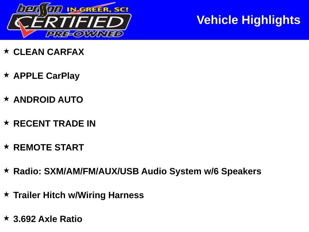 BLIND SPOT AND CROSS PATH DETECTION, LANE DEPARTURE WARNING, FORWARD COLLISION WARNING, PEDESTRIAN DETECTION, ADAPTIVE CRUISE CONTROL, HEATED FRONT SEATS, CARFAX ONE OWNER, BACKUP CAMERA, CLEAN CARFAX, APPLE CarPlay, ANDROID AUTO, RECENT TRADE IN, REMOTE START, 4WD, 3.692 Axle Ratio, Radio: SXM/AM/FM/AUX/USB Audio System w/6 Speakers, Trailer Hitch w/Wiring Harness.Recent Arrival!All prices exclude sales tax, tag, title and registration. Final prices may be subject to credit approval. Additionally, we do not and cannot guarantee that every vehicle sold will be recall-free. Visit safercar.gov to determine whether an individual vehicle is subject to an open recall. All discounted new vehicle prices include any available incentives in lieu of factory APR specials. We make every effort to ensure accurate and reliable information, but are not responsible for website errors. Mention this advertisement to your salesperson and sales management to receive the advertised price. Advertised prices are subject to $239 millennium package if already applied to advertised vehicle.