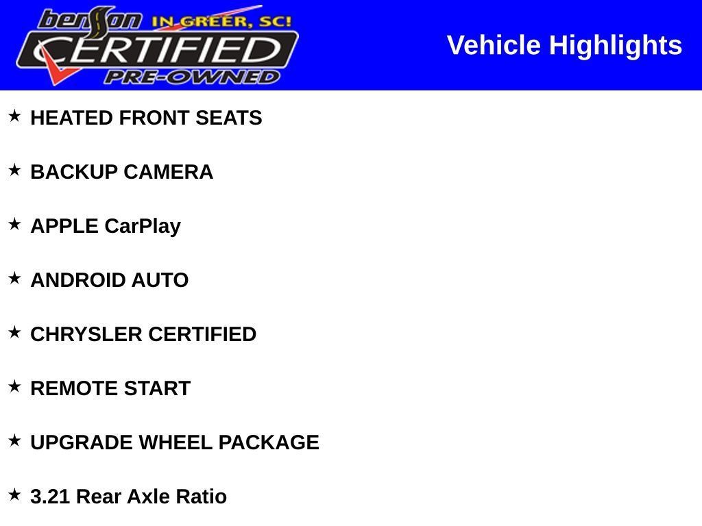 PRICED BELOW J.D.POWER RETAIL PRICE OF $37,750. HEATED FRONT SEATS, BACKUP CAMERA, APPLE CarPlay, ANDROID AUTO, CHRYSLER CERTIFIED, REMOTE START, UPGRADE WHEEL PACKAGE, 3.21 Rear Axle Ratio. Certified.Recent Arrival!FCA US LLC Certified Pre-Owned Details: * Roadside Assistance * 125 Point Inspection * Powertrain Limited Warranty: 84 Month/100,000 Mile (whichever comes first) from original in-service date * Vehicle History * Transferable Warranty * Warranty Deductible: $100 * Limited Warranty: 3 Month/3,000 Mile (whichever comes first) after new car warranty expires or from certified purchase date * Vehicles Up to 75,000 Miles and/or 5 Model Years. 24-Hour Towing & Roadside Assistance, Car Rental Allowance, CARFAX® Vehicle History ReportTM and an Introductory 3-month Subscription to SiriusXM® Satellite Radio & Certified Warranty UpgradesAll prices exclude sales tax, tag, title and registration. Final prices may be subject to credit approval. Additionally, we do not and cannot guarantee that every vehicle sold will be recall-free. Visit safercar.gov to determine whether an individual vehicle is subject to an open recall. All discounted new vehicle prices include any available incentives in lieu of factory APR specials. We make every effort to ensure accurate and reliable information, but are not responsible for website errors. Mention this advertisement to your salesperson and sales management to receive the advertised price. Advertised prices are subject to $239 millennium package if already applied to advertised vehicle.