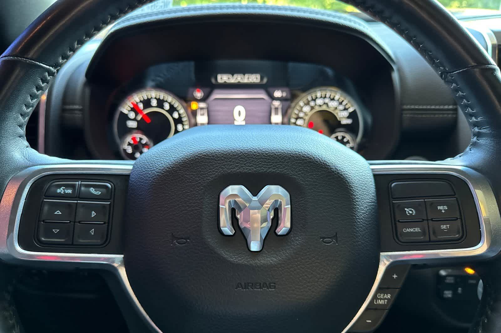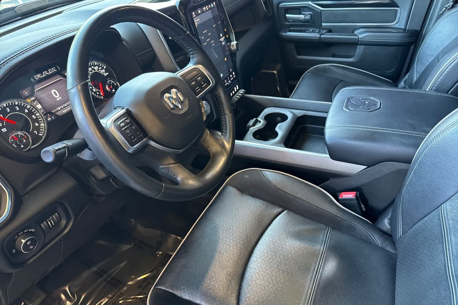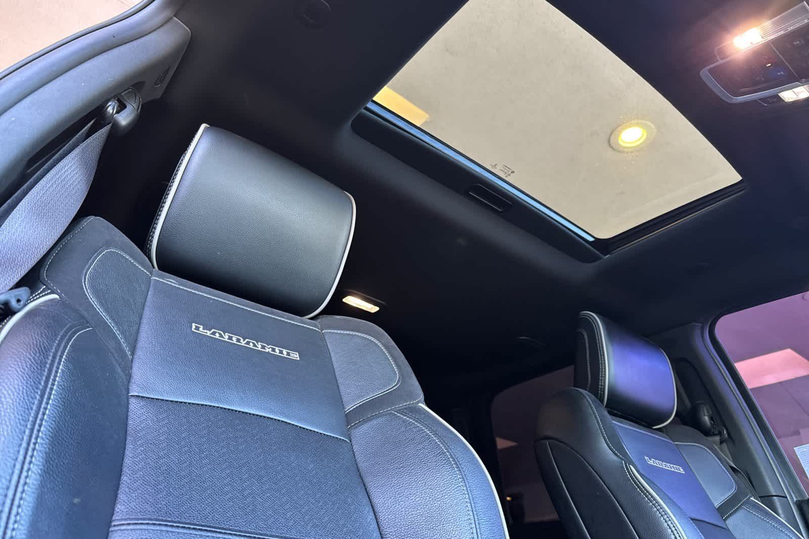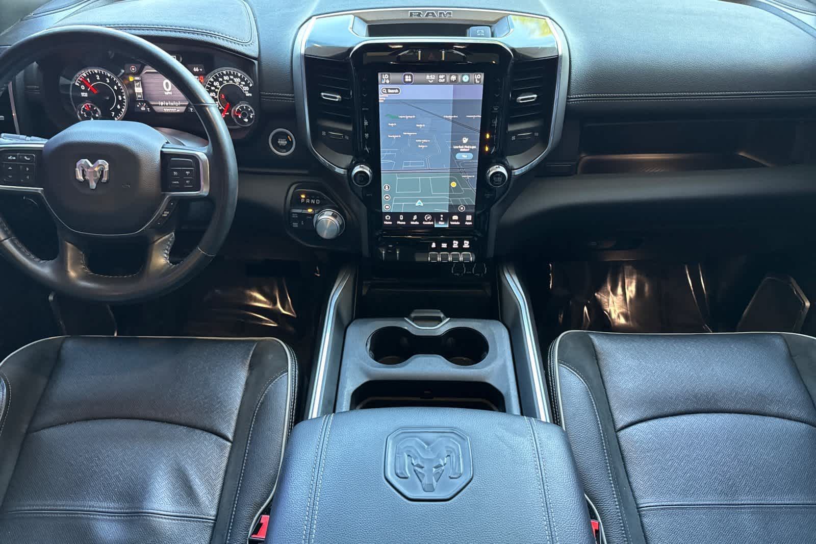 LARAMIE LEVEL B EQUIPMENT GROUP Mirror-Mounted Aux Reverse Lamps, Rain Sensitive Windshield Wipers, Power Adjustable Pedals w/Memory, Power Chrome Tow Mirrors w/Convex Spotter & Memory, Remote Tailgate Release, 17 Speaker harman/kardon Premium Sound, Auto High Beam Headlamp Control, Exterior Mirrors w/Memory, Heated Second Row Seats, Foam Bottle Insert (Door Trim Panel), 2nd Row In Floor Storage Bins, Radio/Driver Seat/Mirrors/Pedals Memory, Radio: Uconnect 5 Nav w/8.4 Display, Off-Road Information Pages, Disassociated Touchscreen Display, HD Radio, For Details, Visit DriveUconnect.com, For More Info, Call 800-643-2112, GPS Navigation, SiriusXM w/360L, All Radio Equipped Vehicles, Connected Travel & Traffic Services, All R1 High Radios, Alexa Built-In, Power Adjustable Convex Aux Mirrors, NIGHT EDITION Mirror-Mounted Aux Reverse Lamps, Black Ram Head Tailgate Badge, Wheels: 20 x 8.0 Black Painted Aluminum, Black Wheel Center Hub, Black Headlamp Bezels, Body Color Door Handles, Painted Front Bumper, Painted Rear Bumper, Tires: LT285/60R20E OWL On/Off Road, Black Exterior Truck Badging, Exterior Mirrors w/Memory, Gloss Black Grille Billets/Accents, Body Color Grille Surround, Black Interior Accents, Black Exterior Mirrors, Black Tail Lamp Bezels, Power Black Tow Mirrors w/Convex Spotter & Memory, Power Adjustable Convex Aux Mirrors, POWER SUNROOF, BLACK, LEATHER TRIMMED BUCKET SEATS Bucket Seats, High Back Seats, #1 Seat Foam Cushion, Folding Flat Load Floor Storage, Full Length Upgraded Floor Console, TRANSMISSION: 8-SPEED AUTO (8HP75-LCV) (STD), ENGINE: 6.4L V8 HEAVY DUTY HEMI MDS (STD).
