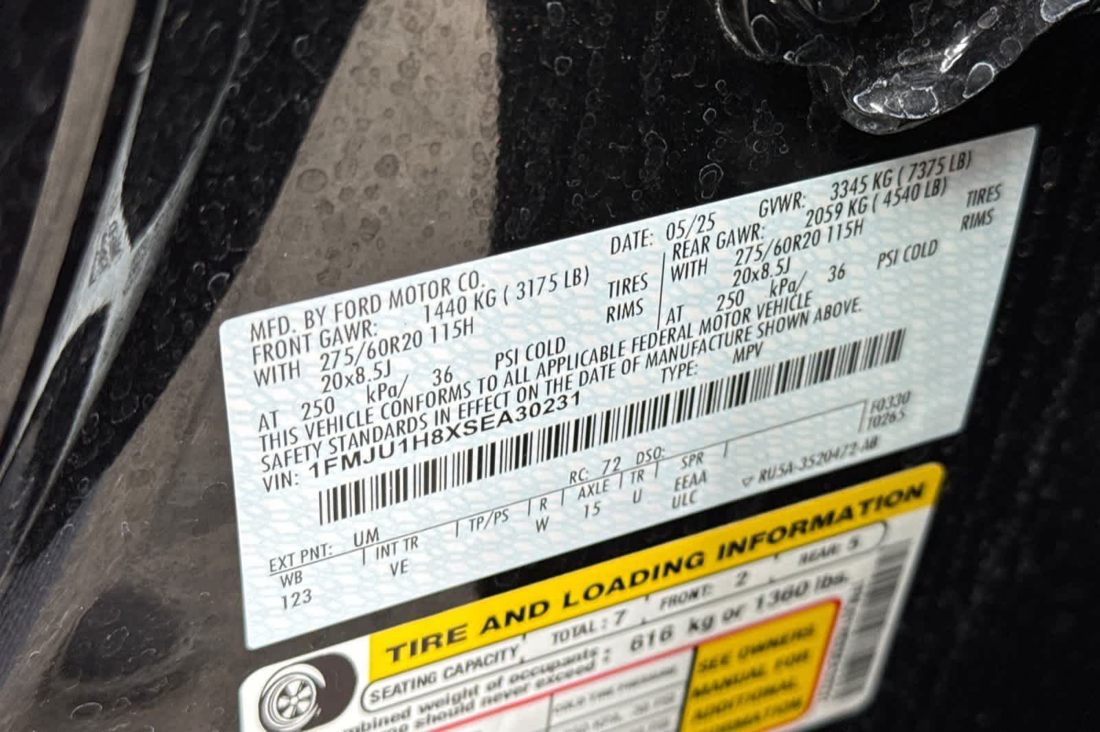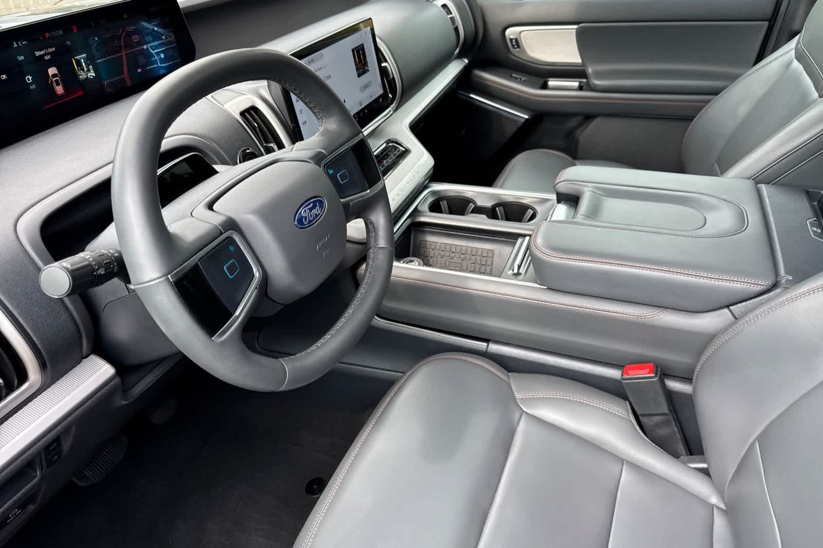 EQUIPMENT GROUP 202A HIGH PACKAGE Ford Split Gate, power upper liftgate and power lower tailgate, Wheels: 20 Carbonized Gray Bright Machined Aluminum, Premium dark tarnish-painted, dark carbonized gray-painted pockets, 360-Degree Zone Lighting, 110V/400W AC Power Outlet, 1 console outlet and one cargo area outlet, BlueCruise Equipped, 90-day trial, Not available to military sales, Universal Garage Door Opener, Power Panoramic Vista Roof w/Power Sunshade, Rain Sensing Wipers, Power Tilt/Telescopic Steering Wheel w/Memory, Memory Driver Seat, Tires: P275/60R20 AS BSW, Ford Co-Pilot360 Active 2.0, Driver State Detection, Intersection Assist, pre-collision assist w/autonomous emergency braking, pedestrian detection, forward collision warning and dynamic brake support, Front Side Laminated.