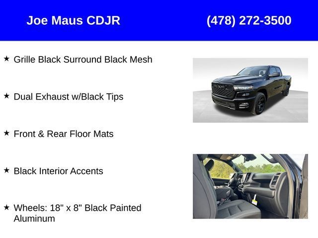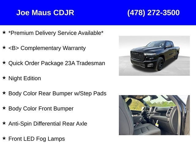 Price may include: 10% Msrp - 2025 National 10% Below MSRP . Exp. 11/03/2025 Joe Maus CDJR home of the free lifetime warranty lets you buy this vehicle right from the comfort of your couch. We frequently deliver vehicles, and even arrange test drives at home, if you are nearby. We will send you a personal walk around video on any vehicle you are interested in. Call, email, or text us for details.* (Plus, you get our free warranty for peace of mind and low-price guarantee)Factory MSRP: $50,450 $7,998 off MSRP! Priced below KBB Fair Purchase Price! Diamond Black Crystal Pearlcoat 2025 Ram 1500 Tradesman 4WD*Premium Delivery Service Available*, * Complementary Warranty, Anti-Spin Differential Rear Axle, Black Interior Accents, Body Color Front Bumper, Body Color Rear Bumper w/Step Pads, Dual Exhaust w/Black Tips, Front & Rear Floor Mats, Front LED Fog Lamps, Grille Black Surround Black Mesh, Night Edition, Quick Order Package 23A Tradesman, Wheels: 18" x 8" Black Painted Aluminum.Awards: * Motor Trend Automobiles of the year Joe Maus CDJR of Dublin has received multiple Dealer of the Year awards in the state of Georgia. Price does not include State/County/Local Tax, Tag, GA Lemon Law or Registration fees. Dealer administrative fee is included in the price. We offer electronic tag and title as an option for an additional fee (this fee is based on what your state/county charge to participate as well as a fee to the company we select to process). A fee may be charged to customers wishing to have the vehicle delivered. New Vehicles - Must finance with Stellantis Financial to receive all rebates and incentives. Not all will qualify for Stellantis Financial. See Dealer for details. Preowned Vehicles - All preowned inventory is “As Is” unless Chrysler Certified or otherwise stated in writing. While we make every effort to ensure the data listed here is correct, there may be instances where some of the factory rebates, incentives, options, or vehicle features may be listed incorrectly as we get data from multiple data sources.*