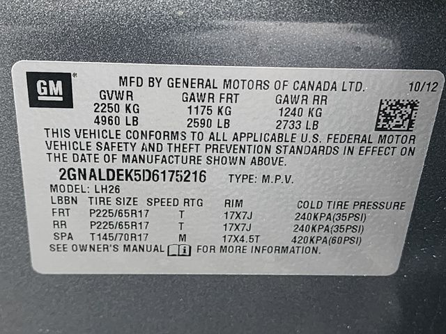 Stock Number: S175216, VIN Number: 2GNALDEK5D6175216, Style Name: LT 4Dr SUV W/ 1LT, Make: Chevrolet, Model: Equinox, Model Year: 2013, Type: SUV, Vehicle Trim: LT, Interior Color: Black, Exterior Color: Steel Green Metallic, Body Type: SUV, MPG Automatic City: 22, MPG Automatic Highway: 32, Engine Description: 2.4L I4, Fuel Type: Gasoline, Fuel Induction: DI, Valves Per Cylinder: 4, Aspiration: Naturally Aspirated, Transmission: 6-Speed Automatic With Overdrive, Wheels Rims: Aluminum Alloy, Wheels Spare Rim Type: Steel, Drive Train Type: FWD, Independent Suspension: Four-Wheel, Stabilizer Bar: Front And Rear, Clock, Compass, External Temp, Low Fuel Level, Tachometer, Front Wipers: Variable Intermittent, Rear Defogger, Rear Wiper: Variable Intermittent, With Washer, Antenna Type: Diversity, Mast, Audio System: AM/FM, Touch Screen Display, Speakers: 6, Drivers Height: Power, Drivers Lumbar: Power, Drivers Power: 4, Seating Capacity: 5, Front Seat Type: Bucket, Upholstery: Premium Cloth, Center Armrest, Center Console: Front Console With Armrest And Storage, Cruise Control, Cupholders: Front, Rear, Power Outlets: 12V Cargo Area, 12V Rear, 4 Total, 12V Front, Seatback Storage, Steering Adjustment: Tilt And Telescopic, Steering Power: Variable/Speed-Proportional, Steering Wheel Control: Audio, Cruise Control, Universal Remote Transmitter, Power Mirrors, Power Door Locks: Anti-Lockout, Windows: Power Windows, Satellite Communication: Onstar, Air Conditioning, Trunk Lights, Mats: Rear, Front, Reading Lights: Front, Steering Wheel Trim: Leather, Vanity Mirrors: Dual Illuminating, Bumpers: Body-Color, NHTSA Passenger Grade: Good, NHTSA Driver Grade: Excellent, NHTSA Side Impact Front Grade: Good, NHTSA Side Impact Back Grade: Excellent, NHTSA Roll Over Resistance Rating: Good, ABS: 4-Wheel, Anti Theft System: Alarm, Vehicle Immobilizer, Safety Locks, Daytime Running Light, Front Headrests: 2, Adjustable, Rear Headrests: 2, Adjustable, Safety Stability Control, Driver And Passenger Airbag, Side Airbag, Stability Control, Front Head Room: 40.9 Inches, Front Hip Room: 54.6 Inches, Front Shoulder Room: 55.8 Inches, Front Leg Room: 41.2 Inches, Rear Head Room: 39.2 Inches, Rear Hip Room: 51.1 Inches, Rear Leg Room: 39.9 Inches, Rear Shoulder Room: 55.3 Inches, Luggage Capacity: 31.5 Cu.Ft., Maximum Seating: 5, Length: 187.8 Inches, Width: 72.5 Inches, Height: 66.3 Inches, Wheelbase: 112.5 Inches, Ground Clearance: 6.9 Inches, Max Gross Vehicle Weight: 4960 Lbs., Curb Weight: 3758 Lbs.