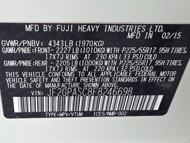 Stock Number: M246698, VIN Number: JF2GPASC8F8246698, Style Name: AWD 2.0I Limited 4Dr Crossover, Make: Subaru, Model: XV Crosstrek, Model Year: 2015, Type: Wagon, Vehicle Trim: 2.0I Limited, Interior Color: Ivory, Exterior Color: White, Body Type: Wagon, MPG Automatic City: 26, MPG Automatic Highway: 34, Engine Description: 2.0L 16V DOHC, Fuel Type: Gasoline, Fuel Induction: SMPI, Valves Per Cylinder: 4, Aspiration: Naturally Aspirated, 4WD Type: Full Time, Transmission: Lineartronic CVT, Wheels Rims: Aluminum Alloy, Wheels Spare Rim Type: Steel, Drive Train Type: AWD, Independent Suspension: Four-Wheel, Stabilizer Bar: Front And Rear, Clock, External Temp, Low Fuel Level, Tachometer, Front Wipers: Variable Intermittent, Privacy Glass, Rear Defogger, Rear Wiper: With Washer, Antenna Type: Diversity, Mast, Audio System: AM/FM, HD Radio, Voice Operated, Touch Screen Display, Speakers: 6, Drivers: Heated, Drivers Height: Manual, Passenger: Heated, Seating Capacity: 5, Front Seat Type: Bucket, Upholstery: Leather-Trimmed, Center Armrest, Folding: Split, Center Console: Front Console With Armrest And Storage, Illuminated, Cruise Control, Cupholders: Front, Rear, Power Outlets: Two 12V Front, Seatback Storage, Steering Adjustment: Tilt And Telescopic, Steering Power, Steering Wheel Control: Audio, Cruise Control, Phone, Paddle Shifter, Power Mirrors, Power Door Locks, Windows: Power Windows, Air Conditioning: Automatic Climate Control, Air Filtration, Trunk Lights, Door Trim: Leatherette, Mats: Rear, Front, Reading Lights: Front, Shift Knob: Leather, Alloy, Steering Wheel Trim: Leather, Alloy, Vanity Mirrors: Dual, Bumpers: Body-Color, NHTSA Passenger Grade: Good, NHTSA Driver Grade: Good, NHTSA Side Impact Front Grade: Excellent, NHTSA Side Impact Back Grade: Excellent, NHTSA Roll Over Resistance Rating: Good, ABS: 4-Wheel, Anti Theft System: Alarm, Vehicle Immobilizer, Perimeter Alarm, Brake Assist, Safety Locks, Daytime Running Light, Fog Lights, Front Headrests: 2, Adjustable, Rear Headrests: 3, Adjustable, Safety Signal Mirrors, Safety Stability Control, Driver and Passenger Airbag, Side Airbag, Stability Control, Front Head Room: 39.8 Inches, Front Hip Room: 52.2 Inches, Front Shoulder Room: 55.6 Inches, Front Leg Room: 43.5 Inches, Rear Head Room: 37.7 Inches, Rear Hip Room: 53.1 Inches, Rear Leg Room: 35.4 Inches, Rear Shoulder Room: 54.2 Inches, Luggage Capacity: 22.3 Cu.Ft., Maximum Seating: 5, Length: 175.2 Inches, Width: 78.2 Inches, Height: 63.6 Inches, Wheelbase: 103.7 Inches, Ground Clearance: 8.7 Inches, Curb Weight: 3208 Lbs.