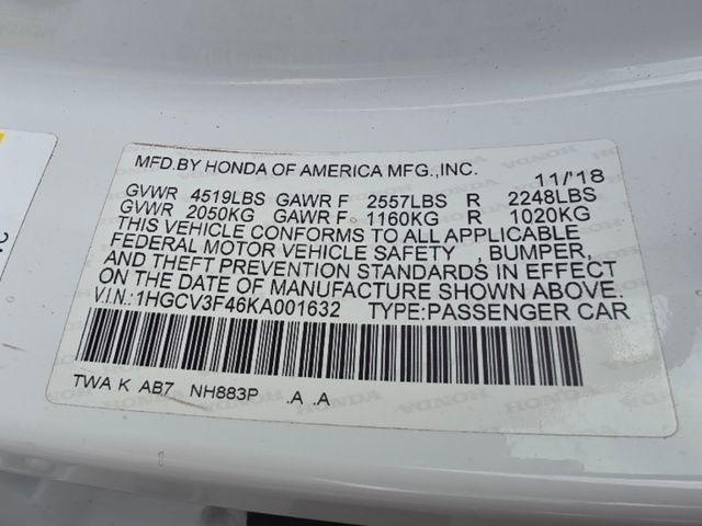 Stock Number: S001632, VIN Number: 1HGCV3F46KA001632, Style Name: EX 4Dr Sedan, Make: Honda, Model: Accord Hybrid, Model Year: 2019, Type: Sedan, Vehicle Trim: EX, Body Type: Sedan, MPG Automatic City: 48, MPG Automatic Highway: 48, Engine Description: 2.0L 4-Cylinder DOHC 16V I-VTEC, Fuel Type: Hybrid-Electric, Fuel Induction: SMPI, Valves Per Cylinder: 4, Aspiration: Naturally Aspirated, Transmission: Ecvt, Wheels Rims: Aluminum Alloy, Drive Train Type: FWD, Independent Suspension: Four-Wheel, Stabilizer Bar: Front And Rear, Clock, External Temp, Low Fuel Level, Front Wipers: Variable Intermittent, Rear Defogger, Sunroof: One-Touch Open/Close, Sliding Sunshade, Anti-Trapping, Power Glass, Tilt/Slide, Antenna Type: Diversity, Mast, Audio System: AM/FM, HD Radio, Touch Screen Display, Speakers: 8, Drivers: Heated, Drivers Height: Power, Drivers Lumbar: 4-Way Power Lumbar, Drivers Power: 12, Passenger: Heated, Seating Capacity: 5, Front Seat Type: Bucket, Upholstery: Cloth, Center Armrest, Folding: Split, Center Console: Front Console With Armrest And Storage, Cupholders: Front, Rear, Power Outlets: 12V Front, Seatback Storage, Steering Adjustment: Tilt And Telescopic, Steering Power: Variable/Speed-Proportional, Steering Wheel Control: Audio, Cruise Control, Phone, Multi-Function, Power Mirrors, Power Door Locks: Anti-Lockout, Auto-Locking, Windows: Power Windows, Air Conditioning: Automatic Climate Control, Air Filtration, Trunk Lights, Dash Trim: Simulated Wood, Door Trim: Simulated Wood, Mats: Rear, Front, Reading Lights: Front, Shift Knob: Urethane, Steering Wheel Trim: Urethane, Vanity Mirrors: Dual Illuminating, Bumpers: Body-Color, NHTSA Passenger Grade: Excellent, NHTSA Driver Grade: Excellent, NHTSA Side Impact Front Grade: Excellent, NHTSA Side Impact Back Grade: Excellent, NHTSA Roll Over Resistance Rating: Excellent, ABS: 4-Wheel, Anti Theft System: Alarm, Vehicle Immobilizer, Brake Assist, Safety Locks, Daytime Running Light: LED, Fog Lights: LED, Headlights Auto Delay, Front Headrests: 2, Adjustable, Rear Headrests: 3, Adjustable, Safety Stability Control, Trunk Release, Driver and Passenger Airbag, Side Airbag, Stability Control, Front Head Room: 37.5 Inches, Front Hip Room: 55.3 Inches, Front Shoulder Room: 58.3 Inches, Front Leg Room: 42.3 Inches, Rear Head Room: 37.2 Inches, Rear Hip Room: 55.0 Inches, Rear Leg Room: 40.4 Inches, Rear Shoulder Room: 56.5 Inches, Luggage Capacity: 16.7 Cu.Ft., Maximum Seating: 5, Length: 192.2 Inches, Width: 73.3 Inches, Height: 57.1 Inches, Wheelbase: 111.4 Inches, Max Gross Vehicle Weight: 4519 Lbs., Curb Weight: 3377 Lbs., Interior Color: Black, Exterior Color: White