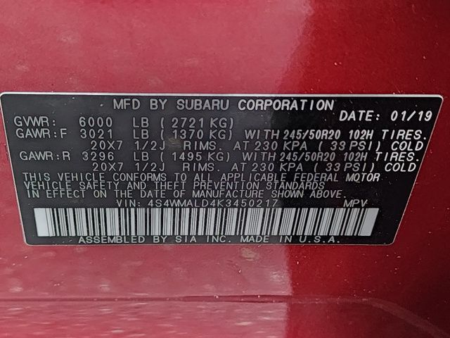 Stock Number: S450217T, VIN Number: 4S4WMALD4K3450217, Style Name: AWD Limited 8-Passenger 4Dr SUV, Make: Subaru, Model: Ascent, Model Year: 2019, Type: SUV, Vehicle Trim: Limited, Interior Color: Black, Body Type: SUV, Exterior Color: Crimson Red Pearl, MPG Automatic City: 20, MPG Automatic Highway: 26, Engine Description: 2.4L DOHC, Fuel Type: Gasoline, Fuel Induction: DI, Valves Per Cylinder: 4, Aspiration: Turbocharged, 4WD Type: Full Time, Transmission: Lineartronic CVT, Wheels Rims: Aluminum Alloy, Wheels Spare Rim Type: Steel, Drive Train Type: AWD, Independent Suspension: Four-Wheel, Stabilizer Bar: Front And Rear, Clock, Compass, External Temp, Heads Up Display, Low Fuel Level, Tachometer, Front Wipers: Variable Intermittent, Privacy Glass, Rear Defogger, Rear Wiper: Intermittent, Auto-On In Reverse, With Washer, Side Window Sunshade, Antenna Type: Diversity, Mast, Audio System: AM/FM, HD Radio, Voice Operated, Touch Screen Display, Speakers: 6, Drivers: Heated, Drivers Height: Power, Drivers Lumbar: Power, Drivers Power: 10, Passenger: Heated, Passenger Power: 4, Seating Capacity: 8, Front Seat Type: Bucket, Upholstery: Leather-Trimmed, Center Armrest, Folding: Split, Flat, Heated, Folding Thirdrow Seat: Split, Flat, Thirdrow Seat Type: 40-60 Split Bench, Center Console: Front Console With Armrest And Storage, Illuminated, Organizer Tray, Cupholders: Front, Third Row, Illuminated, Rear, Overhead Console: Front, Power Outlets: 12V Cargo Area, Two 12V Front, Seatback Storage, Steering Adjustment: Tilt And Telescopic, Steering Power: Variable/Speed-Proportional, Steering Wheel Control: Audio, Cruise Control, Phone, Multi-Function, Paddle Shifter, Voice Control, Universal Remote Transmitter: Homelink - Garage Door Opener, Auto Dimming Mirrors, Power Mirrors, Power Door Locks: Anti-Lockout, Auto-Locking, Windows: Power Windows, Satellite Communication: Voice Guided Directions, Memory Features Number Of Drivers: 2 Driver, Air Conditioning: Automatic Climate Control, Air Filtration, Trunk Lights, Center Console Trim: Leatherette, Dash Trim: Leatherette, Door Trim: Leatherette, Mats: Rear, Front, Reading Lights: Front, Rear, Third Row, Shift Knob: Leather, Steering Wheel Trim: Leather, Vanity Mirrors: Dual Illuminating, Bumpers: Body-Color, NHTSA Passenger Grade: Excellent, NHTSA Driver Grade: Excellent, NHTSA Side Impact Front Grade: Excellent, NHTSA Side Impact Back Grade: Excellent, NHTSA Roll Over Resistance Rating: Good, ABS: 4-Wheel, Anti Theft System: Alarm, Vehicle Immobilizer, Brake Assist, Safety Locks, Cornering Lights, Daytime Running Light, Fog Lights: LED, Headlights Auto Delay, Front Headrests: 2, Adjustable, Rear Headrests: 3, Adjustable, Third Row Headrests: 3, Adjustable, Safety Signal Mirrors, Safety Stability Control, Driver And Passenger Airbag, Side Airbag, Stability Control, Front Head Room: 41.3 Inches, Front Hip Room: 57.7 Inches, Front Shoulder Room: 61.1 Inches, Front Leg Room: 42.2 Inches, Rear Head Room: 40.0 Inches, Rear Hip Room: 57.5 Inches, Rear Leg Room: 38.5 Inches, Rear Shoulder Room: 60.3 Inches, Luggage Capacity: 17.8 Cu.Ft., Maximum Seating: 8, Length: 196.8 Inches, Width: 86.1 Inches, Height: 71.6 Inches, Wheelbase: 113.8 Inches, Ground Clearance: 8.7 Inches, Max Gross Vehicle Weight: 6000 Lbs., Curb Weight: 4515 Lbs.