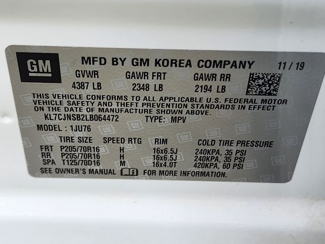 Stock Number: C064472T, VIN Number: KL7CJNSB2LB064472, Style Name: AWD LS 4Dr Crossover, Make: Chevrolet, Model: Trax, Model Year: 2020, Type: Wagon, Vehicle Trim: LS, Interior Color: Jet Black, Exterior Color: Summit White, Body Type: Wagon, MPG Automatic City: 24, MPG Automatic Highway: 29, Engine Description: 1.4L I4, Fuel Type: Gasoline, Fuel Induction: SMPI, Valves Per Cylinder: 4, Aspiration: Turbocharged, 4WD Type: On Demand, Transmission: 6-Speed Automatic, Wheels Rims: Aluminum Alloy, Wheels Spare Rim Type: Steel, Drive Train Type: AWD, Independent Suspension: Four-Wheel, Stabilizer Bar: Front, Clock, Compass, External Temp, Low Fuel Level, Tachometer, Front Wipers: Intermittent, Rear Defogger, Rear Wiper: Auto-On In Reverse, With Washer, Antenna Type: Mast, Audio System: AM/FM, Voice Operated, Touch Screen Display, Speakers: 6, Drivers Height: Manual, Drivers Lumbar: Power, Seating Capacity: 5, Front Seat Type: Bucket, Upholstery: Cloth, Center Armrest, Folding: Split, Flat, Center Console: Front Console With Storage, Cupholders: Front, 6, Rear, Overhead Console: Front, Power Outlets: 12V Front, Seatback Storage, Steering Adjustment: Tilt And Telescopic, Steering Power, Steering Wheel Control: Audio, Phone, Voice Control, Power Mirrors, Power Door Locks: Anti-Lockout, Auto-Locking, Windows: Power Windows, Satellite Communication: Onstar, Voice Guided Directions, Air Conditioning, Air Filtration, Trunk Lights, Mats: Rear, Front, Reading Lights: Front, Shift Knob: Chrome, Steering Wheel Trim: Urethane, Vanity Mirrors: Dual, Bumpers: Body-Color, NHTSA Passenger Grade: Excellent, NHTSA Driver Grade: Excellent, NHTSA Side Impact Front Grade: Excellent, NHTSA Side Impact Back Grade: Excellent, NHTSA Roll Over Resistance Rating: Good, ABS: 4-Wheel, Anti Theft System: Alarm, Brake Assist, Safety Locks, Daytime Running Light, Headlights Auto Delay, Front Headrests: 2, Adjustable, Rear Headrests: 2, Adjustable, Safety Stability Control, Driver And Passenger Airbag, Side Airbag, Stability Control, Front Head Room: 39.6 Inches, Front Hip Room: 51.7 Inches, Front Shoulder Room: 54.1 Inches, Front Leg Room: 40.8 Inches, Rear Head Room: 38.8 Inches, Rear Hip Room: 50.7 Inches, Rear Leg Room: 35.7 Inches, Rear Shoulder Room: 52.8 Inches, Luggage Capacity: 18.7 Cu.Ft., Maximum Seating: 5, Length: 167.6 Inches, Width: 69.9 Inches, Height: 65.2 Inches, Wheelbase: 100.6 Inches, Ground Clearance: 6.2 Inches, Max Gross Vehicle Weight: 4387 Lbs., Curb Weight: 3267 Lbs.