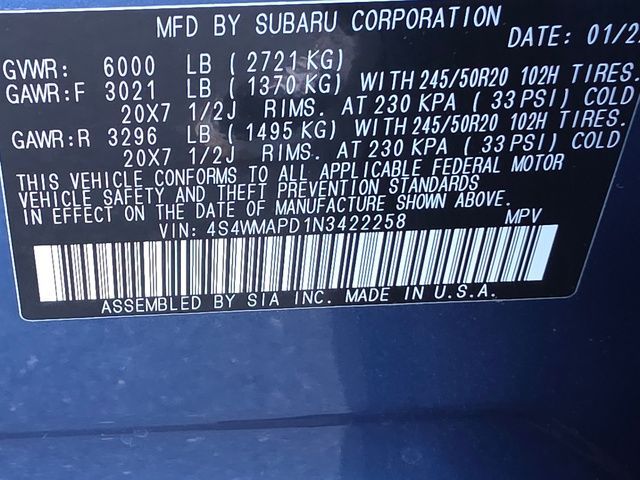 Stock Number: S422258, VIN Number: 4S4WMAPD1N3422258, Style Name: AWD Limited 7-Passenger 4Dr SUV, Make: Subaru, Model: Ascent, Model Year: 2022, Type: SUV, Vehicle Trim: Limited, Interior Color: Ivory, Exterior Color: Abyss Blue Pearl, Body Type: SUV, MPG Automatic City: 20, MPG Automatic Highway: 26, Engine Description: 2.4L 4-Cylinder DOHC 16V, Fuel Type: Gasoline, Fuel Induction: DI, Valves Per Cylinder: 4, Aspiration: Turbocharged, 4WD Type: Full Time, Transmission: Lineartronic CVT, Wheels Rims: Aluminum Alloy, Wheels Spare Rim Type: Steel, Drive Train Type: AWD, Independent Suspension: Four-Wheel, Stabilizer Bar: Front And Rear, Clock, Compass, External Temp, Heads Up Display, Low Fuel Level, Tachometer, Front Wipers: Variable Intermittent, Privacy Glass, Rear Defogger, Rear Wiper: Intermittent, Auto-On In Reverse, With Washer, Side Window Sunshade, Antenna Type: Diversity, Mast, Audio System: AM/FM, HD Radio, Voice Operated, Touch Screen Display, Speakers: 6, Drivers: Heated, Drivers Height: Power, Drivers Lumbar: Power, Drivers Power: 10, Passenger: Heated, Passenger Power: 4, Seating Capacity: 7, Front Seat Type: Bucket, Upholstery: Leather-Trimmed, Folding: Split, Flat, Heated, Folding Thirdrow Seat: Split, Flat, Thirdrow Seat Type: 40-60 Split Bench, Center Console: Front Console With Armrest And Storage, Illuminated, Organizer Tray, Cupholders: Front, Third Row, Illuminated, Rear, Overhead Console: Front, Power Outlets: 12V Cargo Area, 12V Rear, Two 12V Front, USB Front, USB-C Rear, Seatback Storage, Steering Adjustment: Tilt And Telescopic, Steering Power: Variable/Speed-Proportional, Steering Wheel Control: Audio, Cruise Control, Phone, Multi-Function, Paddle Shifter, Voice Control, Universal Remote Transmitter: Homelink - Garage Door Opener, Auto Dimming Mirrors, Power Mirrors, Power Door Locks: Anti-Lockout, Auto-Locking, Windows: Power Windows, Satellite Communication: Voice Guided Directions, Memory Features Number Of Drivers: 2 Driver, Air Conditioning: Automatic Climate Control, Air Filtration, Trunk Lights, Center Console Trim: Leatherette, Dash Trim: Leatherette, Door Trim: Leatherette, Mats: Rear, Front, Reading Lights: Front, Rear, Third Row, Shift Knob: Leather, Steering Wheel Trim: Leather, Vanity Mirrors: Dual Illuminating, Bumpers: Body-Color, NHTSA Passenger Grade: Excellent, NHTSA Driver Grade: Excellent, NHTSA Side Impact Front Grade: Excellent, NHTSA Side Impact Back Grade: Excellent, NHTSA Roll Over Resistance Rating: Good, ABS: 4-Wheel, Anti Theft System: Alarm, Vehicle Immobilizer, Brake Assist, Safety Locks, Cornering Lights, Daytime Running Light, Fog Lights: LED, Headlights Auto Delay, Front Headrests: 2, Adjustable, Rear Headrests: 2, Adjustable, Third Row Headrests: 3, Adjustable, Safety Signal Mirrors, Safety Stability Control, Driver And Passenger Airbag, Side Airbag, Stability Control, Front Head Room: 41.3 Inches, Front Hip Room: 57.7 Inches, Front Shoulder Room: 61.1 Inches, Front Leg Room: 42.2 Inches, Rear Head Room: 40.0 Inches, Rear Hip Room: 57.5 Inches, Rear Leg Room: 38.6 Inches, Rear Shoulder Room: 60.3 Inches, Luggage Capacity: 17.8 Cu.Ft., Maximum Seating: 7, Length: 196.8 Inches, Width: 86.1 Inches, Height: 71.6 Inches, Wheelbase: 113.8 Inches, Ground Clearance: 8.7 Inches, Max Gross Vehicle Weight: 6000 Lbs., Curb Weight: 4499 Lbs.