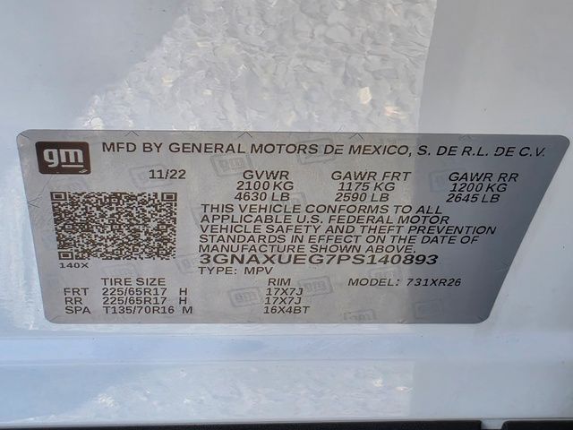 Stock Number: L140893A, VIN Number: 3GNAXUEG7PS140893, Style Name: 4X4 LT 4Dr SUV W/1LT, Make: Chevrolet, Model: Equinox, Model Year: 2023, Type: SUV, Vehicle Trim: LT, Interior Color: Black, Exterior Color: Beige, Body Type: SUV, MPG Automatic City: 24, MPG Automatic Highway: 30, Engine Description: 1.5L DOHC, Fuel Type: Gasoline, Fuel Induction: DI, Valves Per Cylinder: 4, Aspiration: Turbocharged, 4WD Type: Part Time, Transmission: 6-Speed Automatic Electronic With Overdrive, Wheels Rims: Aluminum Alloy, Wheels Spare Rim Type: Steel, Drive Train Type: AWD, Independent Suspension: Four-Wheel, Stabilizer Bar: Front And Rear, Clock, Compass, External Temp, Low Fuel Level, Tachometer, Front Wipers: Variable Intermittent, Privacy Glass, Rear Defogger, Rear Wiper: Intermittent, Auto-On In Reverse, With Washer, Antenna Type: Diversity, Mast, Audio System: AM/FM, Voice Operated, Touch Screen Display, Speakers: 6, Drivers Height: Power, Drivers Lumbar: Power, Drivers Power: 8, Passenger Height: Power, Seating Capacity: 5, Front Seat Type: Bucket, Upholstery: Premium Cloth, Center Armrest, Folding: Split, Center Console: Front Console With Armrest And Storage, Cruise Control, Cupholders: Front, Rear, Overhead Console: Front, Power Outlets: 12V Cargo Area, 12V Front, USB Front, USB-C Front, USB Rear, Seatback Storage, Steering Adjustment: Tilt And Telescopic, Steering Power, Steering Wheel Control: Audio, Cruise Control, Phone, Multi-Function, Voice Control, Power Mirrors, Power Door Locks: Anti-Lockout, Auto-Locking, Windows: Power Windows, Satellite Communication: Onstar, Voice Guided Directions, Air Conditioning, Air Filtration, Trunk Lights, Mats: Rear, Front, Reading Lights: Front, Rear, Shift Knob: Chrome, Steering Wheel Trim: Urethane, Vanity Mirrors: Dual Illuminating, Bumpers: Body-Color, Chrome Accents, NHTSA Passenger Grade: Excellent, NHTSA Driver Grade: Excellent, NHTSA Side Impact Front Grade: Excellent, NHTSA Side Impact Back Grade: Excellent, NHTSA Roll Over Resistance Rating: Good, ABS: 4-Wheel, Anti Theft System: Alarm, Vehicle Immobilizer, Brake Assist, Safety Locks, Daytime Running Light: LED, Headlights Auto Delay, Front Headrests: 2, Adjustable, Rear Headrests: 2, Adjustable, Safety Stability Control, Driver And Passenger Airbag, Side Airbag, Stability Control, Front Head Room: 40.0 Inches, Front Hip Room: 54.2 Inches, Front Shoulder Room: 57.2 Inches, Front Leg Room: 40.9 Inches, Rear Head Room: 38.5 Inches, Rear Hip Room: 51.7 Inches, Rear Leg Room: 39.9 Inches, Rear Shoulder Room: 55.5 Inches, Luggage Capacity: 29.9 Cu.Ft., Maximum Seating: 5, Length: 183.1 Inches, Width: 72.6 Inches, Height: 65.4 Inches, Wheelbase: 107.3 Inches, Ground Clearance: 7.9 Inches, Max Gross Vehicle Weight: 4630 Lbs., Curb Weight: 3478 Lbs.