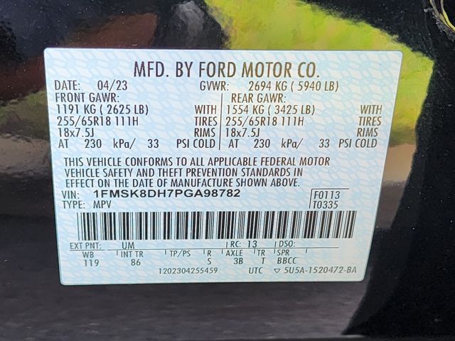 Stock Number: CA98782T, VIN Number: 1FMSK8DH7PGA98782, Style Name: AWD XLT 4Dr SUV, Make: Ford, Model: Explorer, Model Year: 2023, Type: SUV, Vehicle Trim: XLT, Interior Color: Ebony, Exterior Color: Agate Black, Body Type: SUV, MPG Automatic City: 20, MPG Automatic Highway: 27, Engine Description: 2.3L I4, Fuel Type: Gasoline, Fuel Induction: DI, Valves Per Cylinder: 4, Aspiration: Turbocharged, 4WD Type: On Demand, Transmission: 10-Speed Automatic, Wheels Rims: Painted Aluminum Alloy, Wheels Spare Rim Type: Steel, Drive Train Type: 4WD, Independent Suspension: Four-Wheel, Stabilizer Bar: Front And Rear, Clock, Compass, External Temp, Low Fuel Level, Tachometer, Front Wipers: Variable Intermittent, Privacy Glass, Rear Defogger, Rear Wiper: Intermittent, With Washer, Antenna Type: Diversity, Mast, Audio System: AM/FM, Voice Operated, Touch Screen Display, Speakers: 6, Drivers: Heated, Drivers Height: Power, Drivers Lumbar: Power, Drivers Power: 10, Passenger: Heated, Passenger Height: Power, Passenger Power: 4, Seating Capacity: 6, Front Seat Type: Bucket, Upholstery: Cloth, Folding: Split, Flat, Folding Thirdrow Seat: Split, Fold Flat Into Floor, Thirdrow Seat Type: 50-50 Split Bench, Cargo Nets, Center Console: Front Console With Armrest And Storage, Cruise Control, Cupholders: Front, Third Row, Rear, Overhead Console: Front, Power Outlets: 12V Cargo Area, 12V Rear, 12V Front, USB Front, USB-C Front, USB Rear, USB-C Rear, Seatback Storage, Steering Adjustment: Tilt And Telescopic, Steering Power: Variable/Speed-Proportional, Steering Wheel Control: Audio, Cruise Control, Phone, Multi-Function, Voice Control, Power Mirrors, Power Door Locks: Anti-Lockout, Auto-Locking, Windows: Power Windows, Air Conditioning: Automatic Climate Control, Air Filtration, Trunk Lights, Dash Trim: Alloy, Door Trim: Alloy, Mats: Rear, Front, Reading Lights: Front, Rear, Third Row, Steering Wheel Trim: Leather, Vanity Mirrors: Dual Illuminating, Bumpers: Body-Color, NHTSA Passenger Grade: Excellent, NHTSA Driver Grade: Excellent, NHTSA Side Impact Front Grade: Excellent, NHTSA Side Impact Back Grade: Excellent, NHTSA Roll Over Resistance Rating: Good, ABS: 4-Wheel, Anti Theft System: Alarm, Vehicle Immobilizer, Perimeter Alarm, Brake Assist, Safety Locks, Daytime Running Light: LED, Headlights Auto Delay, Front Headrests: 2, Adjustable, Rear Headrests: 2, Adjustable, Third Row Headrests: 2, Adjustable, Safety Signal Mirrors, Safety Stability Control, Driver And Passenger Airbag, Side Airbag, Stability Control, Front Head Room: 40.7 Inches, Front Hip Room: 59.2 Inches, Front Shoulder Room: 61.8 Inches, Front Leg Room: 43.0 Inches, Rear Head Room: 40.5 Inches, Rear Hip Room: 59.1 Inches, Rear Leg Room: 39.0 Inches, Rear Shoulder Room: 61.9 Inches, Luggage Capacity: 18.2 Cu.Ft., Maximum Seating: 7, Length: 198.8 Inches, Width: 89.3 Inches, Height: 70.2 Inches, Wheelbase: 119.1 Inches, Ground Clearance: 7.9 Inches, Max Gross Vehicle Weight: 5905 Lbs., Curb Weight: 4437 Lbs.