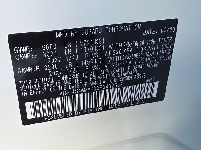 Stock Number: S432669, VIN Number: 4S4WMAKD3P3432669, Style Name: AWD Onyx Edition Limited 4Dr SUV, Make: Subaru, Model: Ascent, Model Year: 2023, Type: SUV, Vehicle Trim: Onyx Edition, Interior Color: Gray With Green Stitching, Exterior Color: Crystal White Pearl, Body Type: SUV, MPG Automatic City: 19, MPG Automatic Highway: 25, Engine Description: 2.4L H4, Fuel Type: Gasoline, Fuel Induction: DI, Valves Per Cylinder: 4, Aspiration: Turbocharged, 4WD Type: Full Time, Transmission: Lineartronic CVT, Wheels Rims: Aluminum Alloy, Wheels Spare Rim Type: Steel, Drive Train Type: AWD, Independent Suspension: Four-Wheel, Stabilizer Bar: Front And Rear, Clock, Compass, External Temp, Heads Up Display, Low Fuel Level, Tachometer, Front Wipers: Variable Intermittent, Privacy Glass, Rear Defogger, Rear Wiper: Intermittent, Auto-On In Reverse, With Washer, Side Window Sunshade, Sunroof: One-Touch Open/Close, Sliding Sunshade, Anti-Trapping, Tilt/Slide, Power Panoramic, Antenna Type: Diversity, Mast, Audio System: AM/FM, HD Radio, Voice Operated, Touch Screen Display, Premium Brand: Harman/Kardon, Speakers: 13, Drivers: Heated, Drivers Height: Power, Drivers Lumbar: 4-Way Power Lumbar, Drivers Power: 12, Passenger: Heated, Passenger Power: 4, Seating Capacity: 7, Front Seat Type: Bucket, Upholstery: Leatherette, Folding: Split, Flat, Heated, Folding Thirdrow Seat: Split, Flat, Thirdrow Seat Type: 40-60 Split Bench, Center Console: Front Console With Armrest And Storage, Illuminated, Organizer Tray, Cupholders: Front, Third Row, Illuminated, Rear, Overhead Console: Front, Power Outlets: 12V Cargo Area, Two 12V Front, 12V Front, USB-C Front, USB-C Rear, USB Third Row, Seatback Storage, Steering Adjustment: Tilt And Telescopic, Steering Power: Variable/Speed-Proportional, Steering Wheel Control: Audio, Cruise Control, Phone, Multi-Function, Paddle Shifter, Voice Control, Universal Remote Transmitter: Homelink - Garage Door Opener, Auto Dimming Mirrors, Power Mirrors, Reverse Tilt Mirror, Power Door Locks: Anti-Lockout, Auto-Locking, Windows: Power Windows, Navigation System: Touch Screen Display, Voice Operated, Memory Card, Satellite Communication: Voice Guided Directions, Memory Features Number Of Drivers: 2 Driver, Air Conditioning: Automatic Climate Control, Air Filtration, Trunk Lights, Center Console Trim: Leatherette, Dash Trim: Leatherette, Door Trim: Simulated Carbon Fiber, Leatherette, Mats: Rear, Front, Reading Lights: Front, Rear, Third Row, Shift Knob: Leather, Steering Wheel Trim: Leather, Vanity Mirrors: Dual Illuminating, Bumpers: Black, NHTSA Passenger Grade: Excellent, NHTSA Driver Grade: Excellent, NHTSA Side Impact Front Grade: Excellent, NHTSA Side Impact Back Grade: Excellent, NHTSA Roll Over Resistance Rating: Good, ABS: 4-Wheel, Anti Theft System: Alarm, Vehicle Immobilizer, Brake Assist, Safety Locks, Cornering Lights, Daytime Running Light, Fog Lights: LED, Headlights Auto Delay, Front Headrests: 2, Adjustable, Rear Headrests: 2, Adjustable, Third Row Headrests: 3, Adjustable, Safety Signal Mirrors, Safety Stability Control, Driver And Passenger Airbag, Side Airbag, Stability Control, Front Head Room: 40.0 Inches, Front Hip Room: 57.8 Inches, Front Shoulder Room: 61.1 Inches, Front Leg Room: 42.2 Inches, Rear Head Room: 38.7 Inches, Rear Hip Room: 57.2 Inches, Rear Leg Room: 38.6 Inches, Rear Shoulder Room: 60.3 Inches, Luggage Capacity: 17.6 Cu.Ft., Maximum Seating: 7, Length: 196.8 Inches, Width: 86.1 Inches, Height: 71.6 Inches, Wheelbase: 113.8 Inches, Ground Clearance: 8.7 Inches, Max Gross Vehicle Weight: 6000 Lbs., Curb Weight: 4570 Lbs.