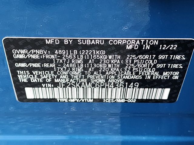 Stock Number: IS436149L, VIN Number: JF2SKAMC6PH436149, Style Name: AWD Wilderness 4Dr Crossover, Make: Subaru, Model: Forester, Model Year: 2023, Type: Wagon, Vehicle Trim: Wilderness, Interior Color: Gray, Exterior Color: Geyser Blue Pearl, Body Type: Wagon, MPG Automatic City: 25, MPG Automatic Highway: 28, Engine Description: 2.5L H4, Fuel Type: Gasoline, Fuel Induction: DI, Valves Per Cylinder: 4, Aspiration: Naturally Aspirated, 4WD Type: Full Time, Transmission: Lineartronic CVT, Wheels Rims: Painted Aluminum Alloy, Wheels Spare Rim Type: Aluminum Alloy, Drive Train Type: AWD, Independent Suspension: Four-Wheel, Stabilizer Bar: Front And Rear, Clock, External Temp, Low Fuel Level, Tachometer, Front Wipers: Variable Intermittent, Privacy Glass, Rear Defogger, Rear Wiper: Intermittent, Auto-On In Reverse, With Washer, Sunroof: One-Touch Open/Close, Sliding Sunshade, Anti-Trapping, Power Panoramic, Antenna Type: Diversity, Mast, Audio System: AM/FM, HD Radio, Voice Operated, Touch Screen Display, Speakers: 6, Drivers: Heated, Drivers Height: Power, Drivers Lumbar: Power, Drivers Power: 10, Passenger: Heated, Seating Capacity: 5, Front Seat Type: Bucket, Upholstery: Vinyl, Center Armrest, Folding: Split, One-Touch Fold Flat, Center Console: Front Console With Armrest And Storage, Illuminated, Organizer Tray, Cupholders: Front, Rear, Overhead Console: Front, Power Outlets: 12V Cargo Area, 12V Rear, 12V Front, USB Front, Seatback Storage, Steering Adjustment: Tilt And Telescopic, Steering Power: Variable/Speed-Proportional, Steering Wheel Control: Audio, Cruise Control, Phone, Multi-Function, Paddle Shifter, Voice Control, Power Mirrors, Power Door Locks: Anti-Lockout, Auto-Locking, Windows: Power Windows, Satellite Communication: Voice Guided Directions, Air Conditioning: Automatic Climate Control, Air Filtration, Trunk Lights, Center Console Trim: Leatherette, Dash Trim: Metallic, Door Trim: Leatherette, Mats: Rear, Front, Reading Lights: Front, Rear, Shift Knob: Urethane, Steering Wheel Trim: Leather, Vanity Mirrors: Dual Illuminating, Bumpers: Silver, NHTSA Passenger Grade: Excellent, NHTSA Driver Grade: Excellent, NHTSA Side Impact Front Grade: Excellent, NHTSA Side Impact Back Grade: Excellent, ABS: 4-Wheel, Anti Theft System: Alarm, Vehicle Immobilizer, Brake Assist, Safety Locks, Cornering Lights, Daytime Running Light, Fog Lights: LED, Headlights Auto Delay, Front Headrests: 2, Adjustable, Rear Headrests: 3, Adjustable, Safety Signal Mirrors, Safety Stability Control, Driver And Passenger Airbag, Side Airbag, Stability Control, Front Head Room: 40.2 Inches, Front Hip Room: 54.1 Inches, Front Shoulder Room: 58.1 Inches, Front Leg Room: 43.3 Inches, Rear Head Room: 37.6 Inches, Rear Hip Room: 53.6 Inches, Rear Leg Room: 39.4 Inches, Rear Shoulder Room: 57.2 Inches, Luggage Capacity: 26.9 Cu.Ft., Maximum Seating: 5, Length: 182.7 Inches, Width: 81.3 Inches, Height: 68.9 Inches, Wheelbase: 104.9 Inches, Ground Clearance: 9.2 Inches, Max Gross Vehicle Weight: 4891 Lbs., Curb Weight: 3620 Lbs.