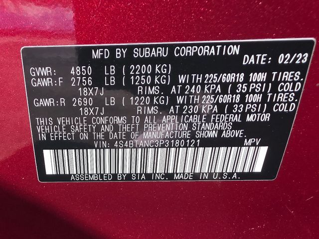 Stock Number: S180121, VIN Number: 4S4BTANC3P3180121, Style Name: AWD Limited 4Dr Crossover, Make: Subaru, Model: Outback, Model Year: 2023, Type: Wagon, Vehicle Trim: Limited, Interior Color: Slate Black, Exterior Color: Crimson Red Pearl, Body Type: Wagon, MPG Automatic City: 26, MPG Automatic Highway: 32, Engine Description: 2.5L 4-Cylinder DOHC 16V, Fuel Type: Gasoline, Fuel Induction: DI, Valves Per Cylinder: 4, Aspiration: Naturally Aspirated, 4WD Type: Full Time, Transmission: CVT Lineartronic, Wheels Rims: Aluminum Alloy, Wheels Spare Rim Type: Steel, Drive Train Type: AWD, Independent Suspension: Four-Wheel, Stabilizer Bar: Front And Rear, Clock, Compass, External Temp, Low Fuel Level, Tachometer, Front Wipers: Variable Intermittent, Privacy Glass, Rear Defogger, Rear Wiper: Intermittent, Auto-On In Reverse, With Washer, Antenna Type: Diversity, Mast, Audio System: AM/FM, HD Radio, Voice Operated, Touch Screen Display, Premium Brand: Harman/Kardon, Speakers: 11, Drivers: Heated, Drivers Height: Power, Drivers Lumbar: Power, Drivers Power: 12, Passenger: Heated, Passenger Height: Power, Passenger Power: 8, Seating Capacity: 5, Front Seat Type: Bucket, Upholstery: Leather-Trimmed, Center Armrest, Folding: Split, One-Touch Fold Flat, Heated, Center Console: Front Console With Armrest And Storage, Illuminated, Cupholders: Front, Rear, Overhead Console: Front, Power Outlets: 12V Cargo Area, 12V Rear, 12V Front, USB Front, USB-C Front, USB Rear, USB-C Rear, Seatback Storage, Steering Adjustment: Tilt And Telescopic, Steering Power: Variable/Speed-Proportional, Steering Wheel Control: Audio, Cruise Control, Phone, Multi-Function, Paddle Shifter, Voice Control, Universal Remote Transmitter: Homelink - Garage Door Opener, Auto Dimming Mirrors, Power Mirrors, Reverse Tilt Mirror, Power Door Locks: Anti-Lockout, Auto-Locking, Windows: Power Windows, Satellite Communication: Voice Guided Directions, Memory Features Number of Drivers: 2 Driver, Air Conditioning: Automatic Climate Control, Air Filtration, Trunk Lights, Center Console Trim: Leatherette, Dash Trim: Leatherette, Door Trim: Leatherette, Metallic, Mats: Rear, Front, Reading Lights: Front, Rear, Shift Knob: Leather, Steering Wheel Trim: Leather, Vanity Mirrors: Dual Illuminating, Bumpers: Body-Color, NHTSA Passenger Grade: Good, NHTSA Driver Grade: Excellent, NHTSA Side Impact Front Grade: Excellent, NHTSA Side Impact Back Grade: Excellent, NHTSA Roll Over Resistance Rating: Good, ABS: 4-Wheel, Anti Theft System: Alarm, Vehicle Immobilizer, Brake Assist, Safety Locks, Cornering Lights, Daytime Running Light: LED, Fog Lights: LED, Headlights Auto Delay, Front Headrests: 2, Adjustable, Rear Headrests: 3, Adjustable, Safety Signal Mirrors, Safety Stability Control, Driver and Passenger Airbag, Side Airbag, Stability Control, Front Head Room: 40.1 Inches, Front Hip Room: 55.5 Inches, Front Shoulder Room: 58.1 Inches, Front Leg Room: 42.8 Inches, Rear Head Room: 39.1 Inches, Rear Hip Room: 54.8 Inches, Rear Leg Room: 39.5 Inches, Rear Shoulder Room: 57.4 Inches, Luggage Capacity: 32.6 Cu.Ft., Maximum Seating: 5, Length: 191.1 Inches, Width: 82.0 Inches, Height: 66.4 Inches, Wheelbase: 108.1 Inches, Ground Clearance: 8.7 Inches, Curb Weight: 3735 Lbs.
