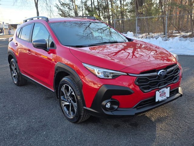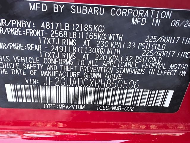 Stock Number: M850506, VIN Number: JF2GUADCXRH850506, Style Name: AWD Premium 4Dr Crossover, Make: Subaru, Model: Crosstrek, Model Year: 2024, Type: Wagon, Vehicle Trim: Premium, Interior Color: Black, Exterior Color: Pure Red, Body Type: Wagon, MPG Automatic City: 27, MPG Automatic Highway: 34, Engine Description: 2.0L 4-Cylinder DOHC 16V, Fuel Type: Gasoline, Fuel Induction: DI, Valves Per Cylinder: 4, Aspiration: Naturally Aspirated, 4WD Type: Full Time, Transmission: Lineartronic CVT, Wheels Rims: Painted Aluminum Alloy, Wheels Spare Rim Type: Steel, Drive Train Type: AWD, Independent Suspension: Four-Wheel, Stabilizer Bar: Front And Rear, Clock, External Temp, Low Fuel Level, Tachometer, Front Wipers: Variable Intermittent, Privacy Glass, Rear Defogger, Rear Wiper: Intermittent, Auto-On In Reverse, With Washer, Antenna Type: Diversity, Mast, Audio System: AM/FM, HD Radio, Voice Operated, Touch Screen Display, Speakers: 6, Drivers Height: Manual, Seating Capacity: 5, Front Seat Type: Bucket, Upholstery: Premium Cloth, Center Armrest, Folding: Split, Center Console: Front Console With Armrest And Storage, Illuminated, Organizer Tray, Cupholders: Front, Rear, Overhead Console: Front, Power Outlets: Two 12V Front, USB Front, USB-C Front, USB-C Rear, Seatback Storage, Steering Adjustment: Tilt And Telescopic, Steering Power: Variable/Speed-Proportional, Steering Wheel Control: Audio, Cruise Control, Phone, Multi-Function, Paddle Shifter, Voice Control, Power Mirrors, Power Door Locks: Anti-Lockout, Auto-Locking, Windows: Power Windows, Satellite Communication: Voice Guided Directions, Air Conditioning: Automatic Climate Control, Air Filtration, Trunk Lights, Center Console Trim: Leatherette, Dash Trim: Simulated Carbon Fiber, Door Trim: Simulated Carbon Fiber, Leatherette, Mats: Rear, Front, Reading Lights: Front, Rear, Shift Knob: Urethane, Steering Wheel Trim: Urethane, Vanity Mirrors: Dual Illuminating, Bumpers: Black, NHTSA Passenger Grade: Excellent, NHTSA Driver Grade: Excellent, NHTSA Side Impact Front Grade: Excellent, NHTSA Side Impact Back Grade: Excellent, NHTSA Roll Over Resistance Rating: Good, ABS: 4-Wheel, Anti Theft System: Alarm, Vehicle Immobilizer, Brake Assist, Safety Locks, Cornering Lights, Daytime Running Light, Fog Lights: LED, Front Headrests: 2, Adjustable, Rear Headrests: 3, Adjustable, Safety Signal Mirrors, Safety Stability Control, Driver and Passenger Airbag, Side Airbag, Stability Control, Front Head Room: 39.8 Inches, Front Hip Room: 55.1 Inches, Front Shoulder Room: 56.8 Inches, Front Leg Room: 42.9 Inches, Rear Head Room: 38.0 Inches, Rear Hip Room: 53.2 Inches, Rear Leg Room: 36.5 Inches, Rear Shoulder Room: 55.3 Inches, Luggage Capacity: 19.9 Cu.Ft., Maximum Seating: 5, Length: 176.4 Inches, Width: 79.4 Inches, Height: 62.8 Inches, Wheelbase: 105.1 Inches, Ground Clearance: 8.7 Inches, Curb Weight: 3296 Lbs.