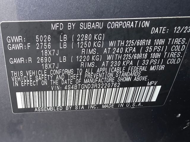 Stock Number: S220762, VIN Number: 4S4BTGND3R3220762, Style Name: AWD Limited XT 4Dr Crossover, Make: Subaru, Model: Outback, Model Year: 2024, Type: Wagon, Vehicle Trim: Limited XT, Interior Color: Titanium Gray, Exterior Color: Magnetite Gray Metallic, Body Type: Wagon, MPG Automatic City: 22, MPG Automatic Highway: 29, Engine Description: 2.4L DOHC, Fuel Type: Gasoline, Fuel Induction: DI, Valves Per Cylinder: 4, Aspiration: Turbocharged, 4WD Type: Full Time, Transmission: CVT Lineartronic, Wheels Rims: Aluminum Alloy, Wheels Spare Rim Type: Steel, Drive Train Type: AWD, Independent Suspension: Four-Wheel, Stabilizer Bar: Front And Rear, Clock, Compass, External Temp, Low Fuel Level, Tachometer, Front Wipers: Variable Intermittent, Privacy Glass, Rear Defogger, Rear Wiper: Intermittent, Auto-On In Reverse, With Washer, Sunroof: One-Touch Open/Close, Sliding Sunshade, Anti-Trapping, Power Glass, Tilt/Slide, Antenna Type: Diversity, Mast, Audio System: AM/FM, HD Radio, Voice Operated, Touch Screen Display, Premium Brand: Harman/Kardon, Speakers: 11, Drivers: Heated, Drivers Height: Power, Drivers Lumbar: Power, Drivers Power: 12, Passenger: Heated, Passenger Height: Power, Passenger Power: 8, Seating Capacity: 5, Front Seat Type: Bucket, Upholstery: Leather-Trimmed, Center Armrest, Folding: Split, One-Touch Fold Flat, Heated, Center Console: Front Console With Armrest And Storage, Illuminated, Cupholders: Front, Rear, Overhead Console: Front, Power Outlets: 12V Cargo Area, 12V Rear, 12V Front, USB Front, USB-C Front, USB Rear, USB-C Rear, Seatback Storage, Steering Adjustment: Tilt And Telescopic, Steering Power: Variable/Speed-Proportional, Steering Wheel Control: Audio, Cruise Control, Phone, Multi-Function, Paddle Shifter, Voice Control, Universal Remote Transmitter: Homelink - Garage Door Opener, Auto Dimming Mirrors, Power Mirrors, Reverse Tilt Mirror, Power Door Locks: Anti-Lockout, Auto-Locking, Windows: Power Windows, Navigation System: Touch Screen Display, Voice Operated, Memory Card, Satellite Communication: Voice Guided Directions, Memory Features Number Of Drivers: 2 Driver, Air Conditioning: Automatic Climate Control, Air Filtration, Trunk Lights, Center Console Trim: Leatherette, Dash Trim: Leatherette, Door Trim: Leatherette, Metallic, Mats: Rear, Front, Reading Lights: Front, Rear, Shift Knob: Leather, Steering Wheel Trim: Leather, Vanity Mirrors: Dual Illuminating, Bumpers: Body-Color, NHTSA Passenger Grade: Good, NHTSA Driver Grade: Excellent, NHTSA Side Impact Front Grade: Excellent, NHTSA Side Impact Back Grade: Excellent, NHTSA Roll Over Resistance Rating: Good, ABS: 4-Wheel, Anti Theft System: Alarm, Vehicle Immobilizer, Brake Assist, Safety Locks, Cornering Lights, Daytime Running Light: LED, Fog Lights: LED, Headlights Auto Delay, Front Headrests: 2, Adjustable, Rear Headrests: 3, Adjustable, Safety Signal Mirrors, Safety Stability Control, Driver And Passenger Airbag, Side Airbag, Stability Control, Front Head Room: 39.1 Inches, Front Hip Room: 55.5 Inches, Front Shoulder Room: 58.1 Inches, Front Leg Room: 42.8 Inches, Rear Head Room: 39.1 Inches, Rear Hip Room: 54.8 Inches, Rear Leg Room: 39.5 Inches, Rear Shoulder Room: 57.4 Inches, Luggage Capacity: 32.6 Cu.Ft., Maximum Seating: 5, Length: 191.1 Inches, Width: 82.0 Inches, Height: 66.4 Inches, Wheelbase: 108.1 Inches, Ground Clearance: 8.7 Inches, Curb Weight: 3931 Lbs.