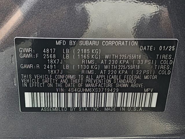 Stock Number: R719429, VIN Number: 4S4GUHM6XS3719429, Style Name: AWD Limited 4Dr Crossover, Make: Subaru, Model: Crosstrek, Model Year: 2025, Type: Wagon, Vehicle Trim: Limited, Exterior Color: Gray, Body Type: Wagon, Interior Color: Gray, Engine Description: 2.5L H4, Fuel Type: Gasoline, Fuel Induction: DI, Valves Per Cylinder: 4, Aspiration: Naturally Aspirated, 4WD Type: Full Time, Transmission: Lineartronic CVT, Wheels Rims: Painted Aluminum Alloy, Wheels Spare Rim Type: Steel, Drive Train Type: AWD, Independent Suspension: Four-Wheel, Stabilizer Bar: Front And Rear, Clock, External Temp, Low Fuel Level, Tachometer, Front Wipers: Variable Intermittent, Privacy Glass, Rear Defogger, Rear Wiper: Intermittent, Auto-On In Reverse, With Washer, Antenna Type: Diversity, Mast, Audio System: AM/FM, HD Radio, Voice Operated, Touch Screen Display, Speakers: 6, Drivers: Heated, Drivers Height: Power, Drivers Lumbar: Power, Drivers Power: 10, Passenger: Heated, Seating Capacity: 5, Front Seat Type: Bucket, Upholstery: Leather-Trimmed, Center Armrest, Folding: Split, Center Console: Front Console With Armrest And Storage, Illuminated, Organizer Tray, Cupholders: Front, Rear, Overhead Console: Front, Power Outlets: Two 12V Front, USB Front, USB-C Front, USB Rear, USB-C Rear, Seatback Storage, Steering Adjustment: Tilt And Telescopic, Steering Power: Variable/Speed-Proportional, Steering Wheel Control: Audio, Cruise Control, Phone, Multi-Function, Paddle Shifter, Voice Control, Power Mirrors, Power Door Locks: Anti-Lockout, Auto-Locking, Windows: Power Windows, Satellite Communication: Voice Guided Directions, Air Conditioning: Automatic Climate Control, Air Filtration, Trunk Lights, Center Console Trim: Leatherette, Dash Trim: Simulated Carbon Fiber, Door Trim: Simulated Carbon Fiber, Leatherette, Mats: Rear, Front, Reading Lights: Front, Rear, Shift Knob: Leather, Steering Wheel Trim: Leather, Vanity Mirrors: Dual Illuminating, Bumpers: Black, NHTSA Passenger Grade: Excellent, NHTSA Driver Grade: Excellent, NHTSA Side Impact Front Grade: Excellent, NHTSA Side Impact Back Grade: Excellent, NHTSA Roll Over Resistance Rating: Good, ABS: 4-Wheel, Anti Theft System: Alarm, Vehicle Immobilizer, Brake Assist, Safety Locks, Cornering Lights, Daytime Running Light, Fog Lights: LED, Headlights Auto Delay, Front Headrests: 2, Adjustable, Rear Headrests: 3, Adjustable, Safety Signal Mirrors, Safety Stability Control, Driver And Passenger Airbag, Side Airbag, Stability Control, Front Head Room: 39.8 Inches, Front Hip Room: 55.1 Inches, Front Shoulder Room: 56.8 Inches, Front Leg Room: 42.9 Inches, Rear Head Room: 38.0 Inches, Rear Hip Room: 53.2 Inches, Rear Leg Room: 36.5 Inches, Rear Shoulder Room: 55.3 Inches, Luggage Capacity: 19.9 Cu.Ft., Maximum Seating: 5, Length: 176.4 Inches, Width: 79.4 Inches, Height: 63.0 Inches, Wheelbase: 105.1 Inches, Ground Clearance: 8.7 Inches, Max Gross Vehicle Weight: 4817 Lbs., Curb Weight: 3349 Lbs.