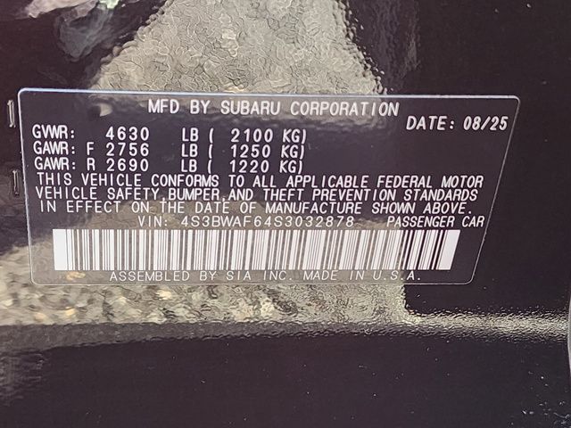 Stock Number: R032878, VIN Number: 4S3BWAF64S3032878, Style Name: AWD Premium 4Dr Sedan, Make: Subaru, Model: Legacy, Model Year: 2025, Type: Sedan, Vehicle Trim: Premium, Exterior Color: Black, Body Type: Sedan, Interior Color: Black, MPG Automatic City: 27, MPG Automatic Highway: 35, Engine Description: 2.5L H4, Fuel Type: Gasoline, Fuel Induction: SMPI, Valves Per Cylinder: 4, Aspiration: Naturally Aspirated, 4WD Type: Full Time, Transmission: Lineartronic CVT, Wheels Rims: Painted Aluminum Alloy, Wheels Spare Rim Type: Steel, Drive Train Type: AWD, Independent Suspension: Four-Wheel, Stabilizer Bar: Front And Rear, Clock, External Temp, Heads Up Display, Low Fuel Level, Tachometer, Front Wipers: Variable Intermittent, Rear Defogger, Antenna Type: Diversity, Mast, Audio System: AM/FM, HD Radio, Voice Operated, Touch Screen Display, Speakers: 6, Drivers: Heated, Drivers Height: Power, Drivers Lumbar: Power, Drivers Power: 10, Passenger: Heated, Seating Capacity: 5, Front Seat Type: Bucket, Upholstery: Cloth, Center Armrest, Folding: Split, Center Console: Front Console With Armrest And Storage, Illuminated, Organizer Tray, Cupholders: Front, Rear, Overhead Console: Front, Power Outlets: 12V Rear, 12V Front, USB Front, USB-C Front, USB Rear, USB-C Rear, Seatback Storage, Steering Adjustment: Tilt And Telescopic, Steering Power: Variable/Speed-Proportional, Steering Wheel Control: Audio, Cruise Control, Phone, Multi-Function, Paddle Shifter, Voice Control, Power Mirrors, Power Door Locks: Anti-Lockout, Auto-Locking, Windows: Power Windows, Satellite Communication: Voice Guided Directions, Air Conditioning: Automatic Climate Control, Air Filtration, Trunk Lights, Center Console Trim: Leatherette, Dash Trim: Simulated Carbon Fiber, Cloth, Door Trim: Simulated Carbon Fiber, Leatherette, Mats: Rear, Front, Reading Lights: Front, Shift Knob: Leather, Steering Wheel Trim: Leather, Vanity Mirrors: Dual Illuminating, Bumpers: Body-Color, NHTSA Passenger Grade: Good, NHTSA Driver Grade: Excellent, NHTSA Side Impact Front Grade: Excellent, NHTSA Side Impact Back Grade: Excellent, NHTSA Roll Over Resistance Rating: Excellent, ABS: 4-Wheel, Anti Theft System: Alarm, Vehicle Immobilizer, Brake Assist, Safety Locks, Cornering Lights, Daytime Running Light: LED, Headlights Auto Delay, Front Headrests: 2, Adjustable, Rear Headrests: 3, Adjustable, Safety Signal Mirrors, Safety Stability Control, Trunk Release, Driver And Passenger Airbag, Side Airbag, Stability Control, Front Head Room: 39.4 Inches, Front Hip Room: 55.5 Inches, Front Shoulder Room: 58.1 Inches, Front Leg Room: 42.8 Inches, Rear Head Room: 37.2 Inches, Rear Hip Room: 54.8 Inches, Rear Leg Room: 39.5 Inches, Rear Shoulder Room: 57.4 Inches, Luggage Capacity: 15.1 Cu.Ft., Maximum Seating: 5, Length: 191.1 Inches, Width: 81.8 Inches, Height: 59.1 Inches, Wheelbase: 108.3 Inches, Ground Clearance: 5.9 Inches, Max Gross Vehicle Weight: 4630 Lbs., Curb Weight: 3508 Lbs.