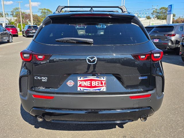 Stock Number: 262A, VIN Number: 7MMVAADW8TN142689, Style Name: AWD Premium 4Dr SUV, Make: Mazda, Model: CX-50 Hybrid, Model Year: 2026, Type: SUV, Vehicle Trim: 50H PRXA, Interior Color: Black W/Brown Stitching, Body Type: SUV, Engine Description: 4, Fuel Type: Hybrid-Electric, Fuel Induction: DI, Valves Per Cylinder: 4, Aspiration: Naturally Aspirated, 4WD Type: On Demand, Transmission: AUTO, Wheels Rims: Painted Aluminum Alloy, Wheels Spare Rim Type: Steel, Drive Train Type: AWD, Independent Suspension: Four-Wheel, Stabilizer Bar: Front, Clock, Compass, External Temp, Low Fuel Level, Tachometer, Front Wipers: Speed Sensitive, Variable Intermittent, Rain Sensing, Privacy Glass, Rear Defogger, Rear Wiper: Intermittent, With Washer, Sunroof: One-Touch Open/Close, Anti-Trapping, Tilt/Slide, Power Panoramic, Power Sunshade, Antenna Type: Diversity, Mast, Audio System: AM/FM, HD Radio, Voice Operated, Touch Screen Display, Premium Brand: Bose, Speakers: 11, Drivers: Heated, Drivers Height: Power, Drivers Lumbar: Power, Drivers Power: 8, Passenger: Heated, Passenger Height: Power, Passenger Power: 6, Seating Capacity: 5, Front Seat Type: Bucket, Upholstery: Leather, Center Armrest, Folding: Split, One-Touch Fold Flat, Center Console: Front Console With Armrest And Storage, Cupholders: Front, Rear, Overhead Console: Front, Power Outlets: 12V Cargo Area, 12V Front, USB-C Front, USB-C Rear, Seatback Storage, Steering Adjustment: Tilt And Telescopic, Steering Power: Variable/Speed-Proportional, Steering Wheel Control: Audio, Cruise Control, Phone, Multi-Function, Voice Control, Auto Dimming Mirrors, Power Mirrors, Power Door Locks: Anti-Lockout, Auto-Locking, Windows: Power Windows, Memory Features Number of Drivers: 2 Driver, Air Conditioning: Automatic Climate Control, Sun Sensor Climate Control, Air Filtration, Trunk Lights, Dash Trim: Leatherette, Door Trim: Leatherette, Mats: Rear, Front, Reading Lights: Front, Rear, Shift Knob: Leather, Steering Wheel Trim: Leather, Vanity Mirrors: Dual Illuminating, Bumpers: Black, ABS: 4-Wheel, Anti Theft System: Vehicle Immobilizer, Brake Assist, Safety Locks, Daytime Running Light: LED, Headlights Auto Delay, Front Headrests: 2, Adjustable, Rear Headrests: 3, Adjustable, Safety Signal Mirrors, Safety Stability Control, Driver and Passenger Airbag, Side Airbag, Stability Control, Front Head Room: 38.6 Inches, Front Hip Room: 53.6 Inches, Front Shoulder Room: 55.9 Inches, Front Leg Room: 41.7 Inches, Rear Head Room: 36.7 Inches, Rear Hip Room: 51.7 Inches, Rear Leg Room: 37.8 Inches, Rear Shoulder Room: 53.6 Inches, Luggage Capacity: 29.2 Cu.Ft., Maximum Seating: 5, Length: 186.1 Inches, Width: 80.8 Inches, Height: 65.6 Inches, Wheelbase: 110.8 Inches, Ground Clearance: 7.6 Inches, Max Gross Vehicle Weight: 5135 Lbs., Curb Weight: 4008 Lbs., Exterior Color: Jet Black Mica