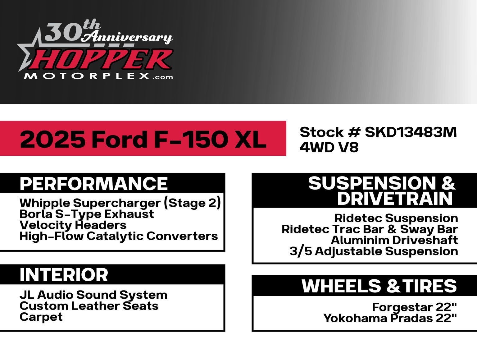 **STOP** CARFAX One-Owner custom asphalt shredding Ford Performance F-150 needing a DRIVER..read onThis truck was built to impress, with G-force inducing upgrades such as dealer installed legendary Ford Performance Whipple Supercharger, Ridetech trac bars, Borla S-type exhaust, Velocity headers, high flow cats, aluminum drive shaft, sturdy fully boxed frame all pull for a 800 HP absolute thrill of a lifetime.Additional upgrades include top shelf custom leather interior, premium sound upgrades, Forgestar 22" performance wheels (fresh 285/45R22 tires), low profile bed cover, and enough punch make Mike Tyson dizzy. CARFAX One-Owner. Silver Metallic 2025 Ford F-150 Ford Performance Standard Cab 4WD 10-Speed Automatic 5.0L V8 2D Standard Cab, 5.0L V8, 4WD, 4-Wheel Disc Brakes, Chrome Bumpers, LED Fog Lamps, Power steering, Power windows, Rear Window Fixed Privacy Glass w/Defroster, Remote keyless entry, Tachometer, Telescoping steering wheel, Tilt steering wheel, Wheels: 17" Silver Painted Aluminum.Recent Arrival!
